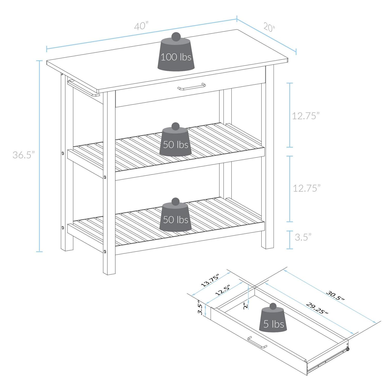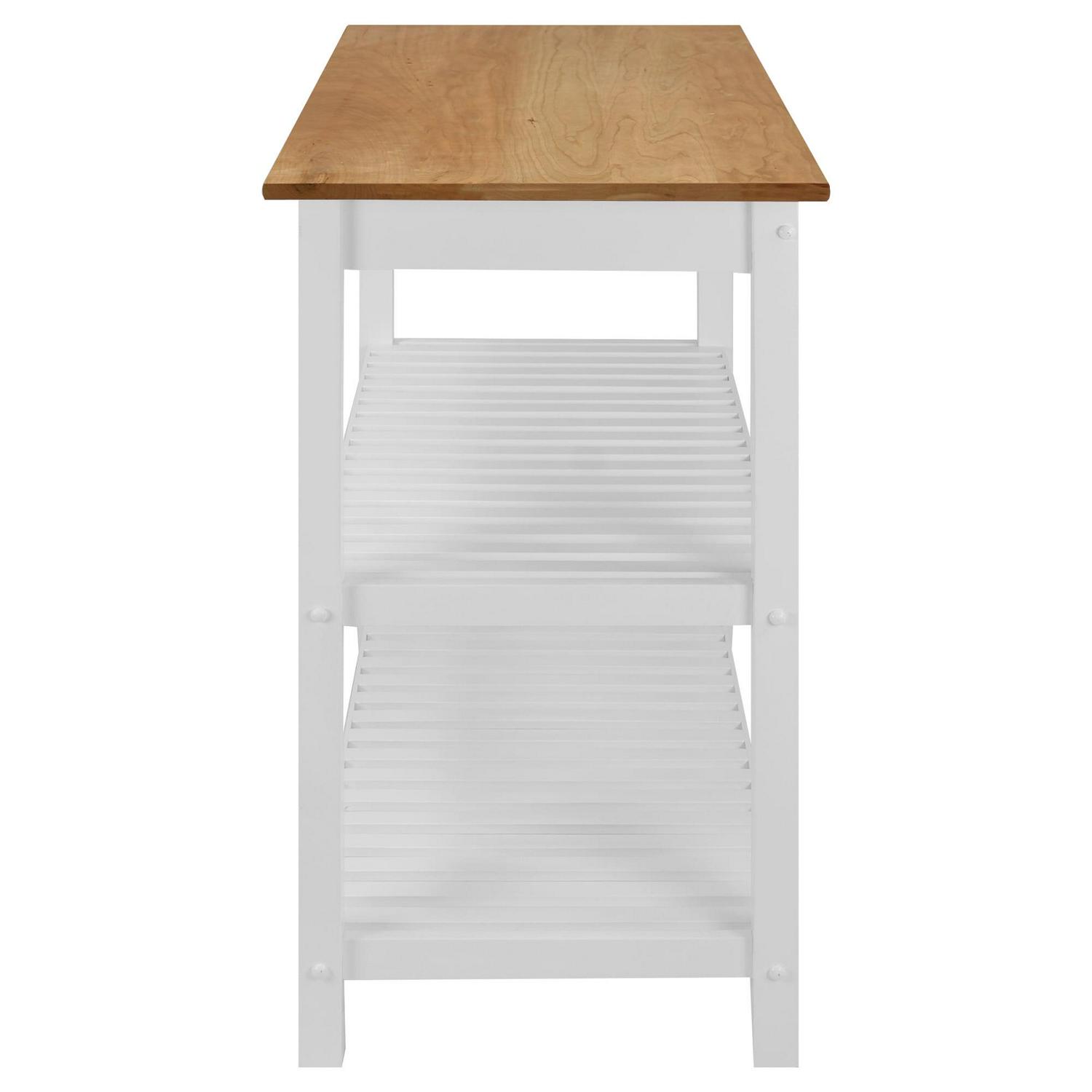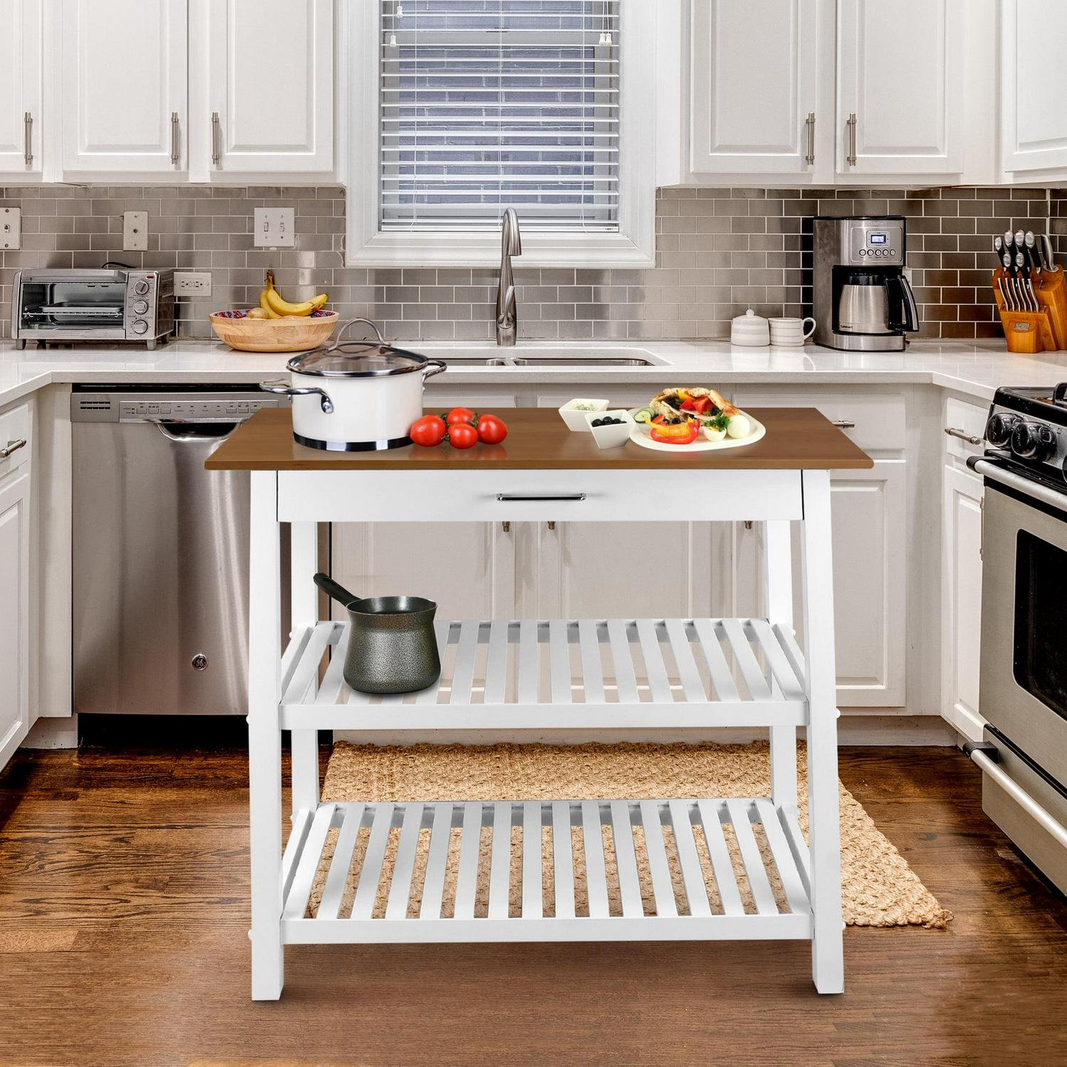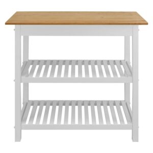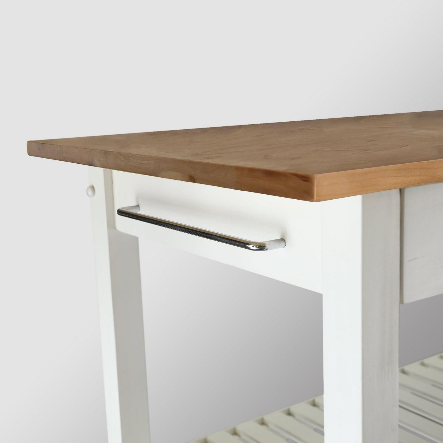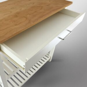 This Kitchen Island cart is the perfect addition to any kitchen that could use some extra counterspace. Its two-tone neutral color design gives it a modern appeal that highlights the natural beauty of the American Cherry top while complementing any current home decor. 2 shelves and a drawer provide multiple ways to keep your kitchen organized and all of your cooking essentials close at hand.