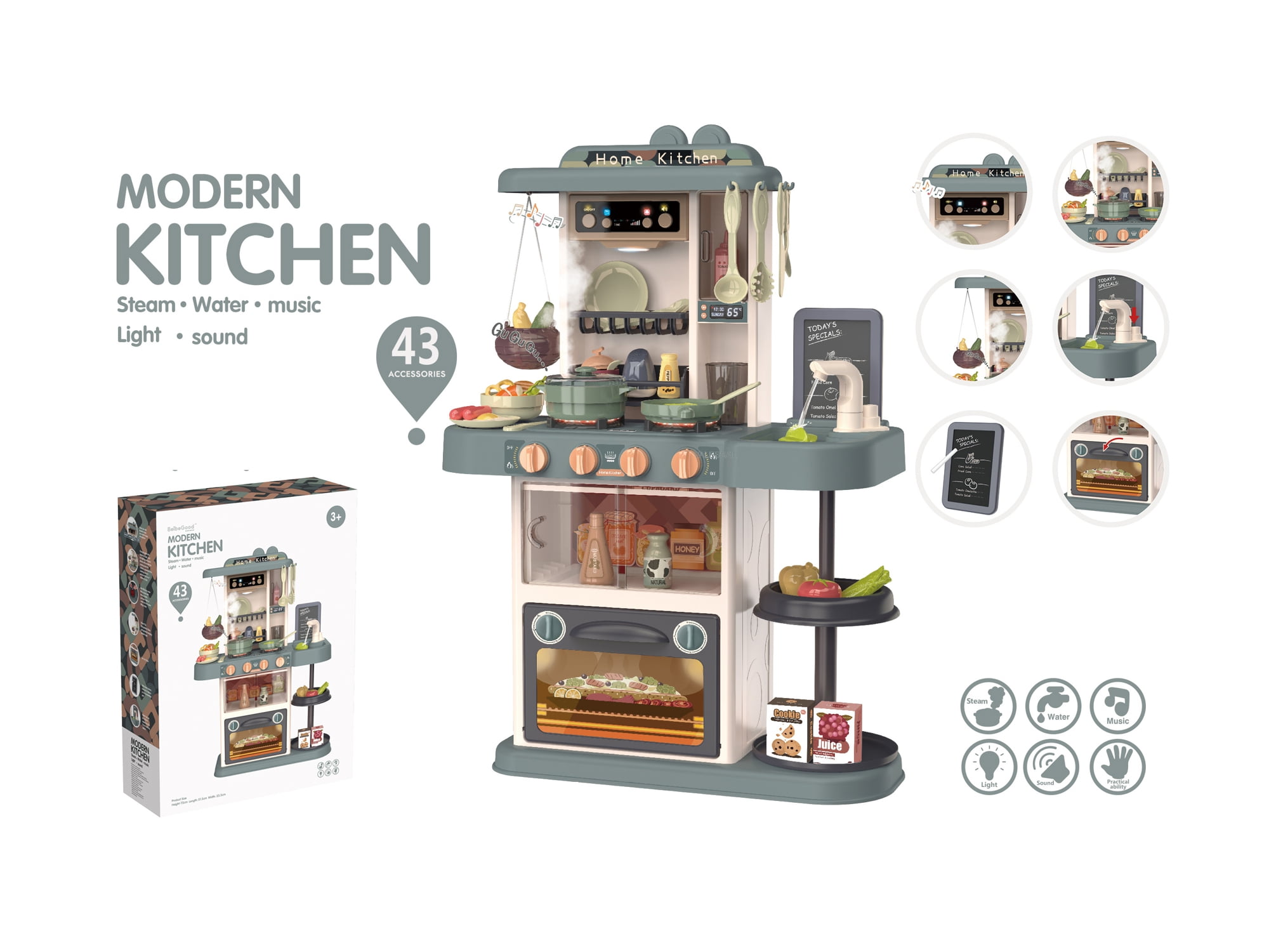 Modern Kitchen set for kids Pretend Play Cook w/ Sound, Light, Real Spray, Drawing and Water Flow, 43 Piece Accessory Set. Simulation cooking Scene, role-play, parent-children interaction. Light music and Shinning Light. Real Spray, simulated cooking for Children. Drawing on board, children can write down the menu. The tap can gives real water, experience the joy of housework by hands-on games. Various ways of open door, as sliding and flat opening. Using basket, shelf, cabinet to increse storage space. Playing cook whit child will be fun and interesting. Toy for toddlers Preschoolers Kids Girls Boys Age 3 4 5 6 7 Years.