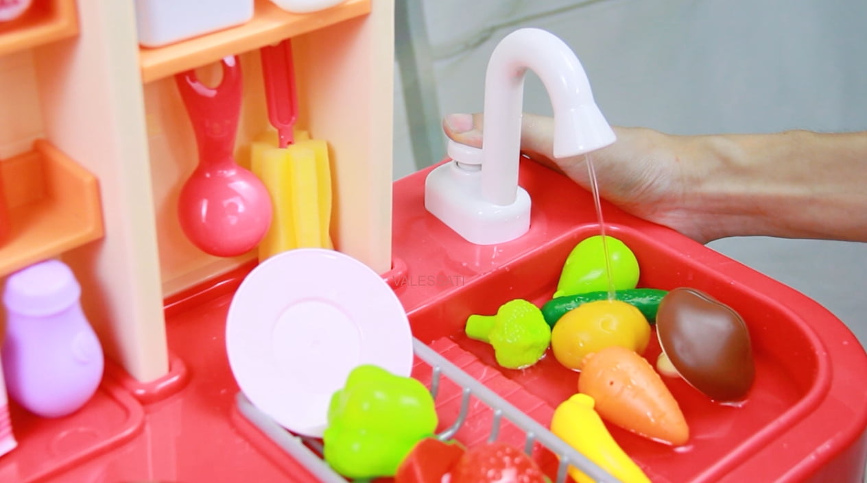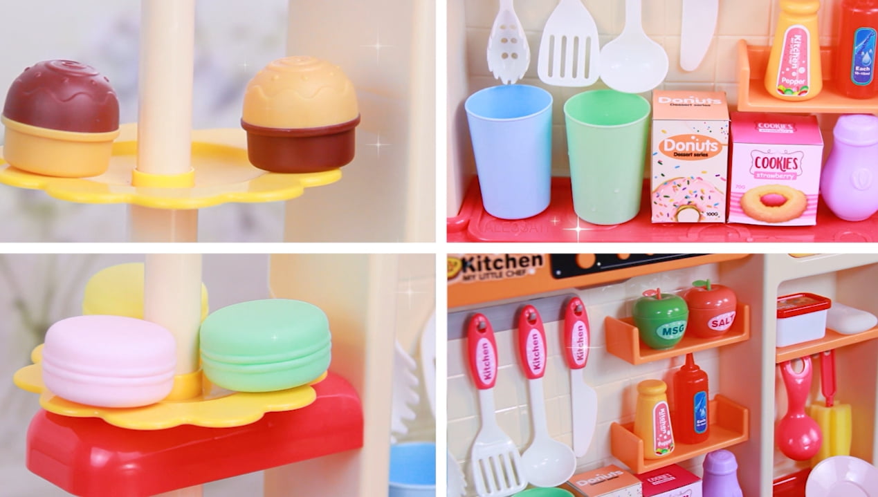 Modern Kitchen set for kids Pretend Play Cook w/ Sound, Light, Real Spray, Drawing and Water Flow, 87 Piece Accessory Set. Simulation cooking Scene, role-play, parent-children interaction. Light music and Shinning Light. Real Spray, simulated cooking for Children. Drawing on board, children can write down the menu. The tap can gives real water, experience the joy of housework by hands-on games. Various ways of open door, as sliding and flat opening. Using shelf, cabinet to increse storage space. Playing cook whit child will be fun and interesting. T. This is an ideal gift for birthdays, parties, Children’s Day, Christmas, Halloween, Thanksgiving and New Year’s Day , suitable for toddlers Preschoolers Kids Girls Boys Age 3 4 5 6 7 Years