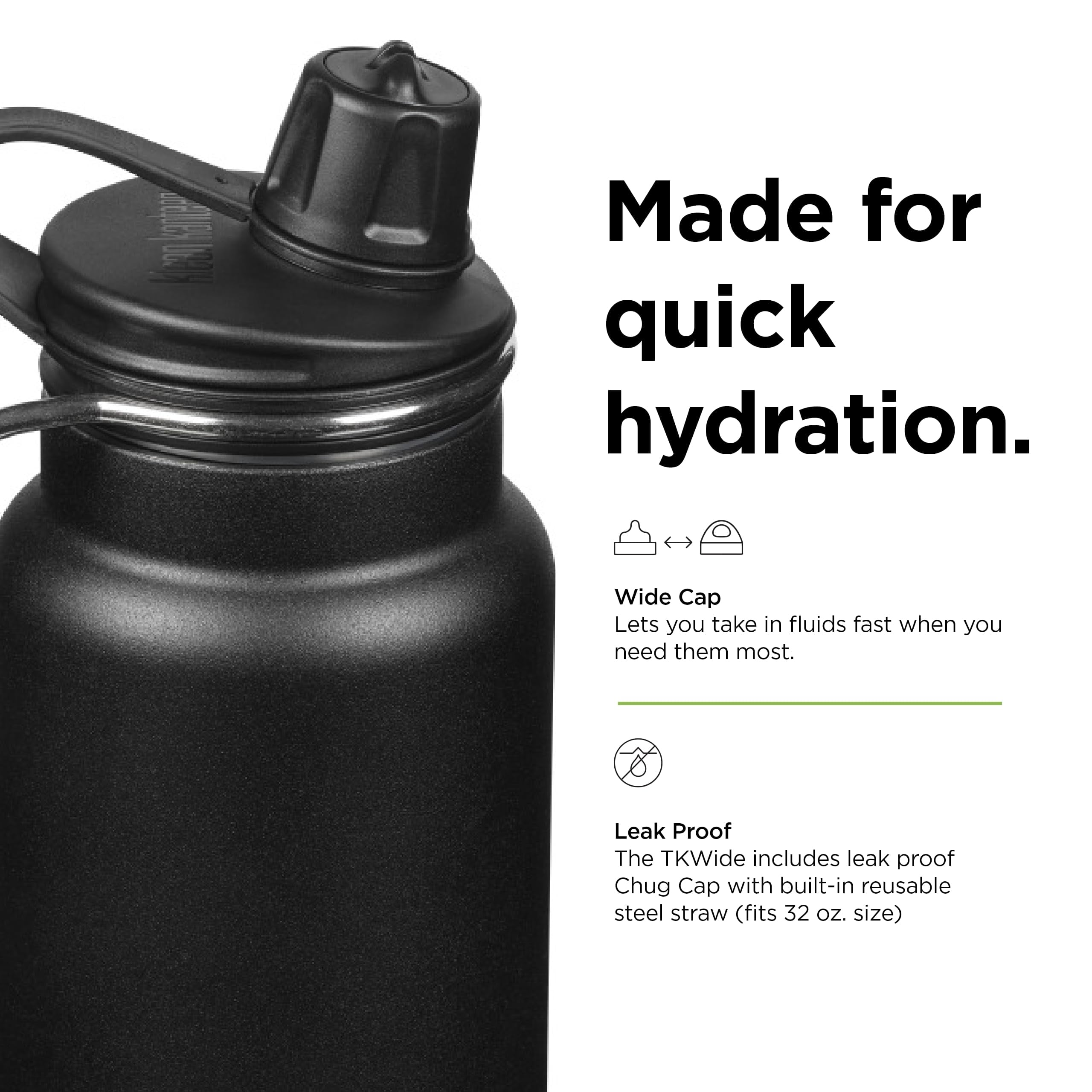 32 fluid ounces Made from certified 90% post-consumer recycled 18/8 stainless steel TK Closure™ internal thread design increases thermal performance and compatible with TKWide caps Climate Lock™ keeps contents iced up to 66 hours Chip-resistant Klean Coat™ powder coat finish BPA Free Won’t retain or impart flavors Includes leak proof Chug Cap for quick hydration Backed by the lifetime Strong as Steel guarantee