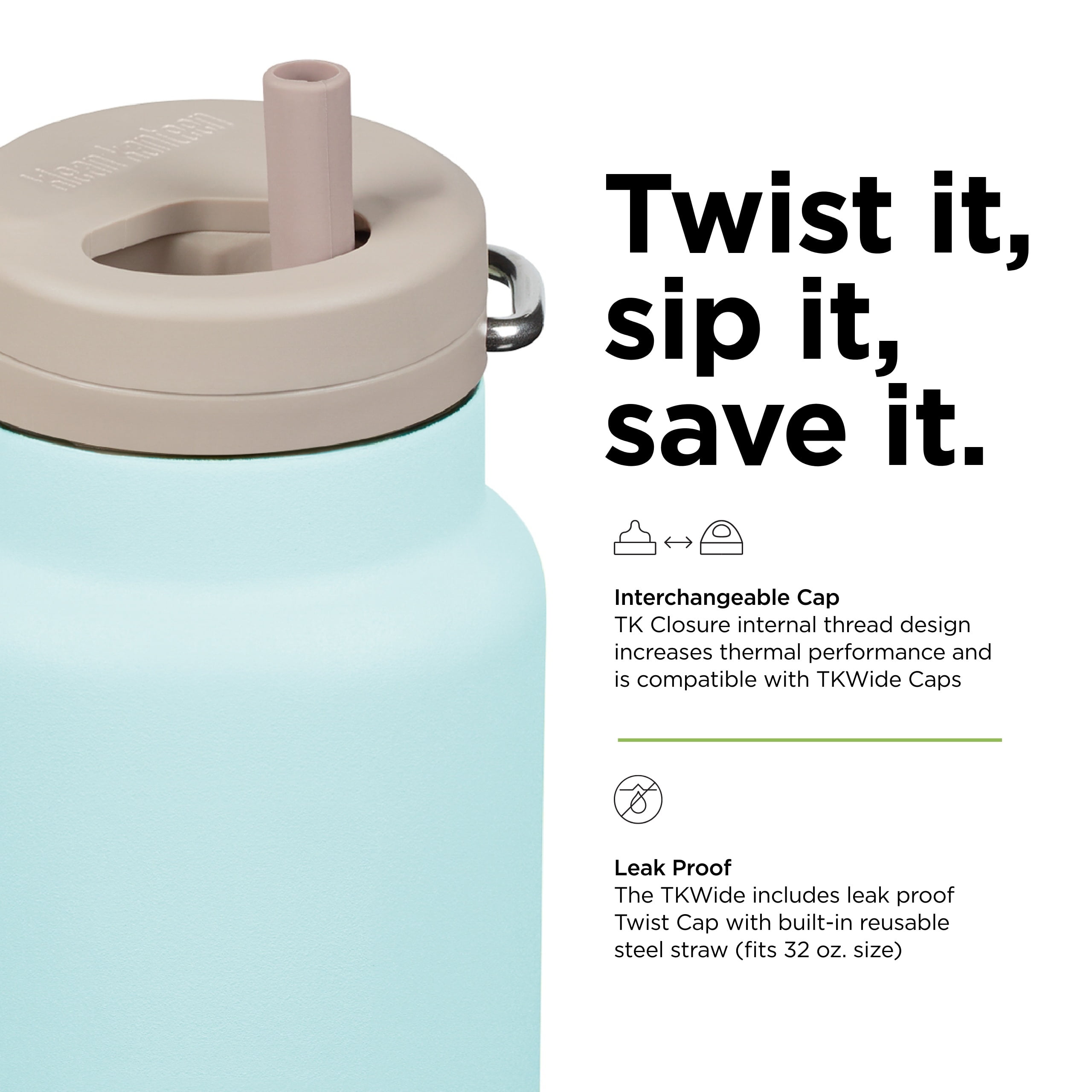 Our 32 oz TKWide insulated water bottle was designed with versatility and portability in mind, to create the best water bottle, iced coffee mug, sport bottle, and insulated cup, all in one package. The TKWide 32 oz features our TK Closure internal thread design with a smooth, rounded lip for comfortable drinking and easy cleaning. It comes with a leak-proof Twist Cap with a built-in reusable steel straw that fits our 32 oz bottles. Klean Coat colors and fun designs make it great for kids and those young at heart! Please note the Twist Cap is not suitable for liquids above room temperature. It is not intended for hot or carbonated beverages because of the steel straw.As a family and employee-owned company, we don’t have to answer to stakeholders. We’re free to operate based on our values every single day. We’ve built our business by prioritizing the well being of people and the planet and by designing sustainable, high-performance products.We believe that all businesses should be accountable for their carbon emissions. As a Climate Neutral Certified Brand since 2019, we measure our footprint annually, reduce what we can, and offset the rest by purchasing verified offsets.Every time you make a purchase from Klean we invest 1% of the sale into organizations working hard to make the world a more resilient and sustainable place. Through our 1% for the Planet membership, our customer community has allowed us to donate over 3.7 million dollars to organizations doing significant work in our key areas of focus: plastic pollution, safe consumer products, conservation and climate, and outdoor stewardship.As a certified B Corp, we’re part of a movement of more than 3,000 global companies that meet high standards of social and environmental transparency, accountability, and performance. Together, we’re redefining success in business.