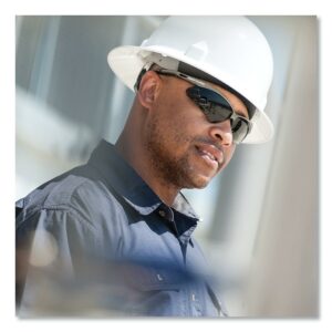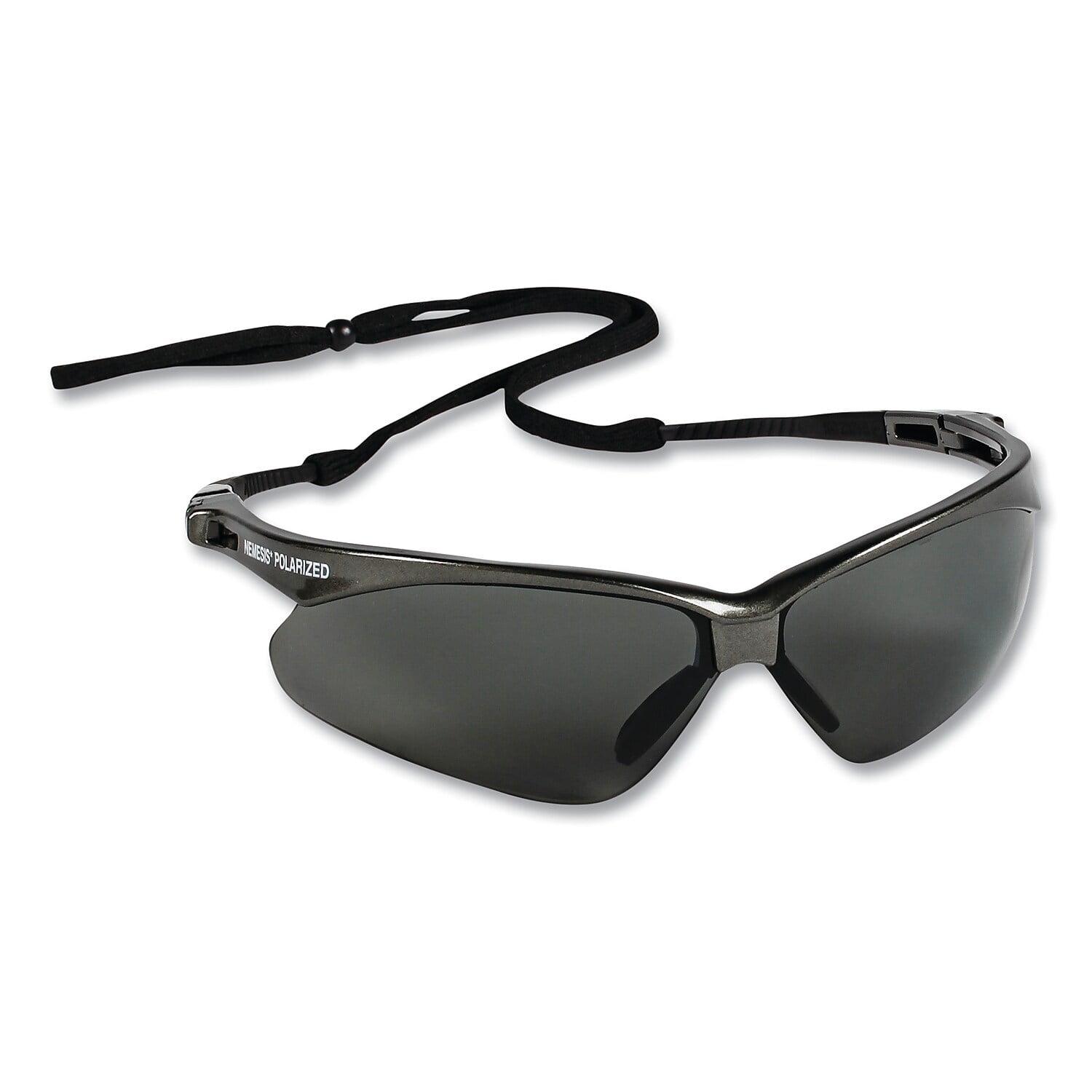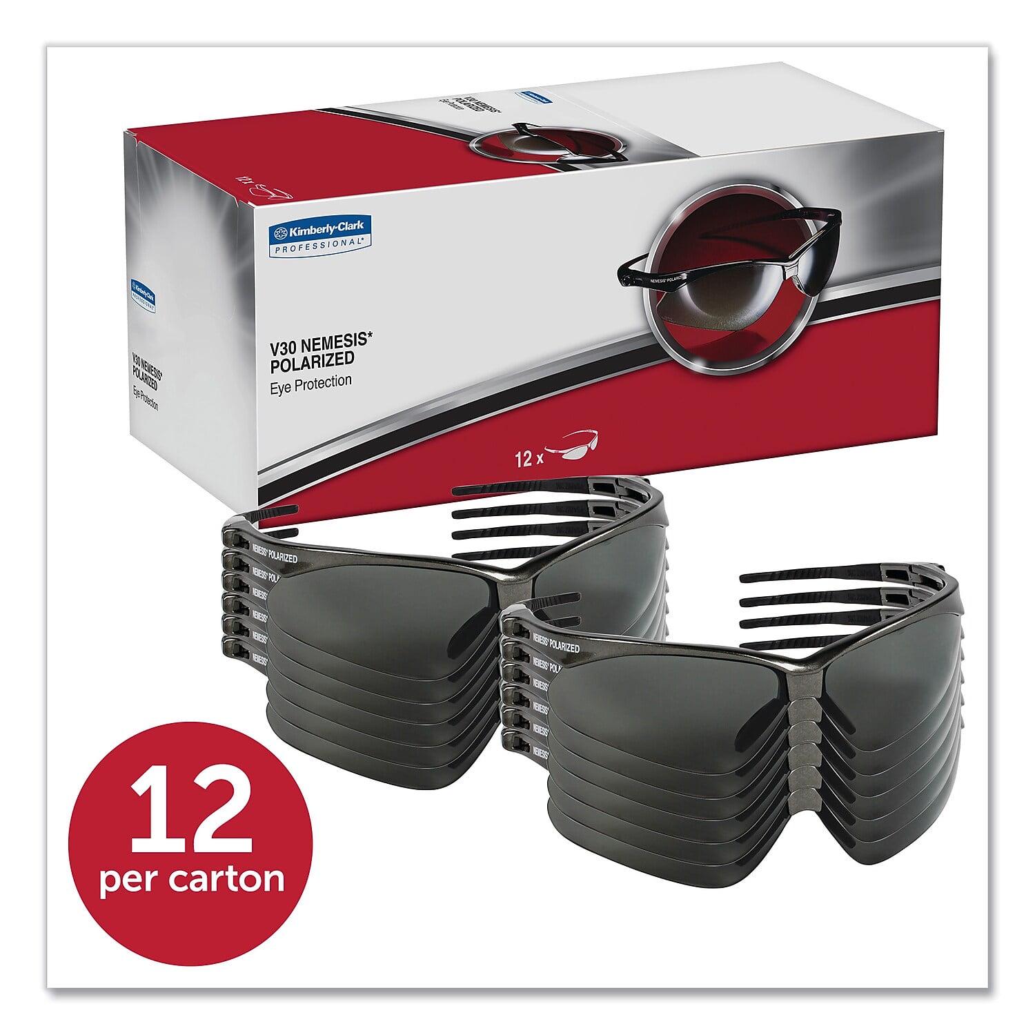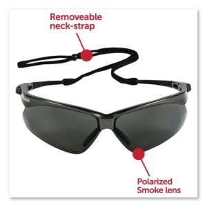 V30 Nemesis Safety Glasses offer stylish good looks and a durable, lightweight construction that’s great for protection both at work and home. KleenGuard Personal Protective Equipment enables rather than inhibits maximum productivity and safety for you and your employees. Polycarbonate lenses provide 99.9 percent UVA/UVB/UVC protection to help prevent eye damage like cataracts, retinal damage and other conditions that can cause temporary vision loss. Polarized smoke lenses meet EN 1836 standard for polarization. Wraparound frame has a base curve of 8 that extends the range of peripheral protection as well as soft-touch temples for comfort. Unisex safety glasses have an extremely flexible, patented nose piece to channel sweat away from your eyes and help prevent slippage down the nose. Each pair of safety glasses comes with a neck cord to keep close and protect your eyes at a moment’s notice. Safety eyewear complies with the ANSI/ISEA Z87.1 plus standard for personal eye protection.