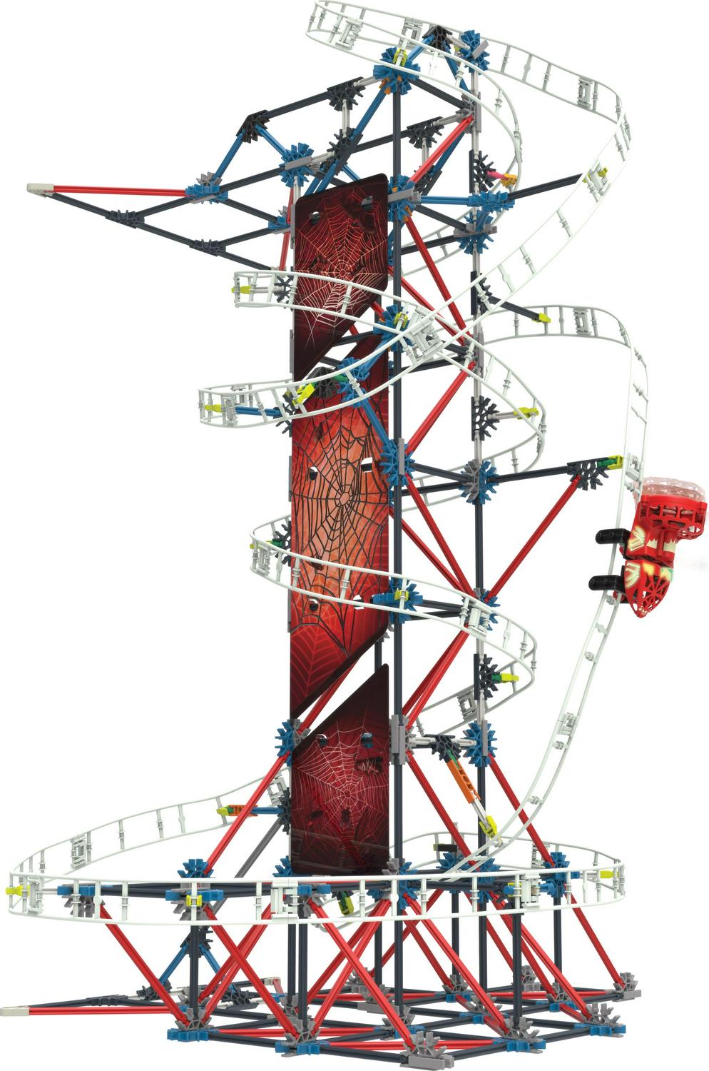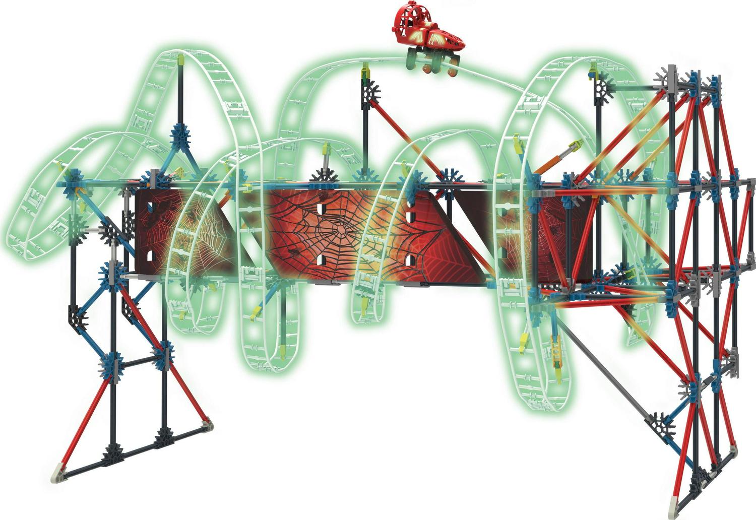 – Air-powered motorized coaster car – The K’NEX Web Weaver Building includes an air-powered car that requires batteries. The battery-powered motor of the coaster lets it travel at record speeds for horizontal and vertical thrills.