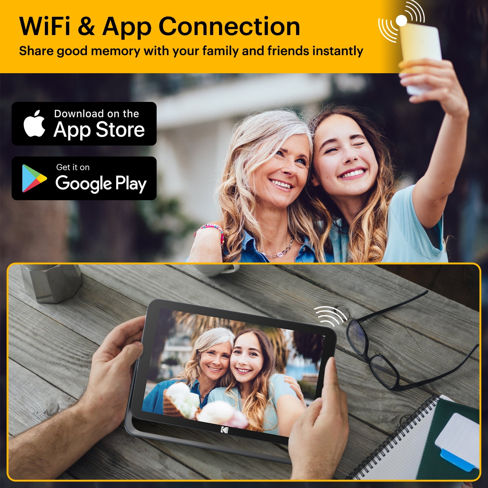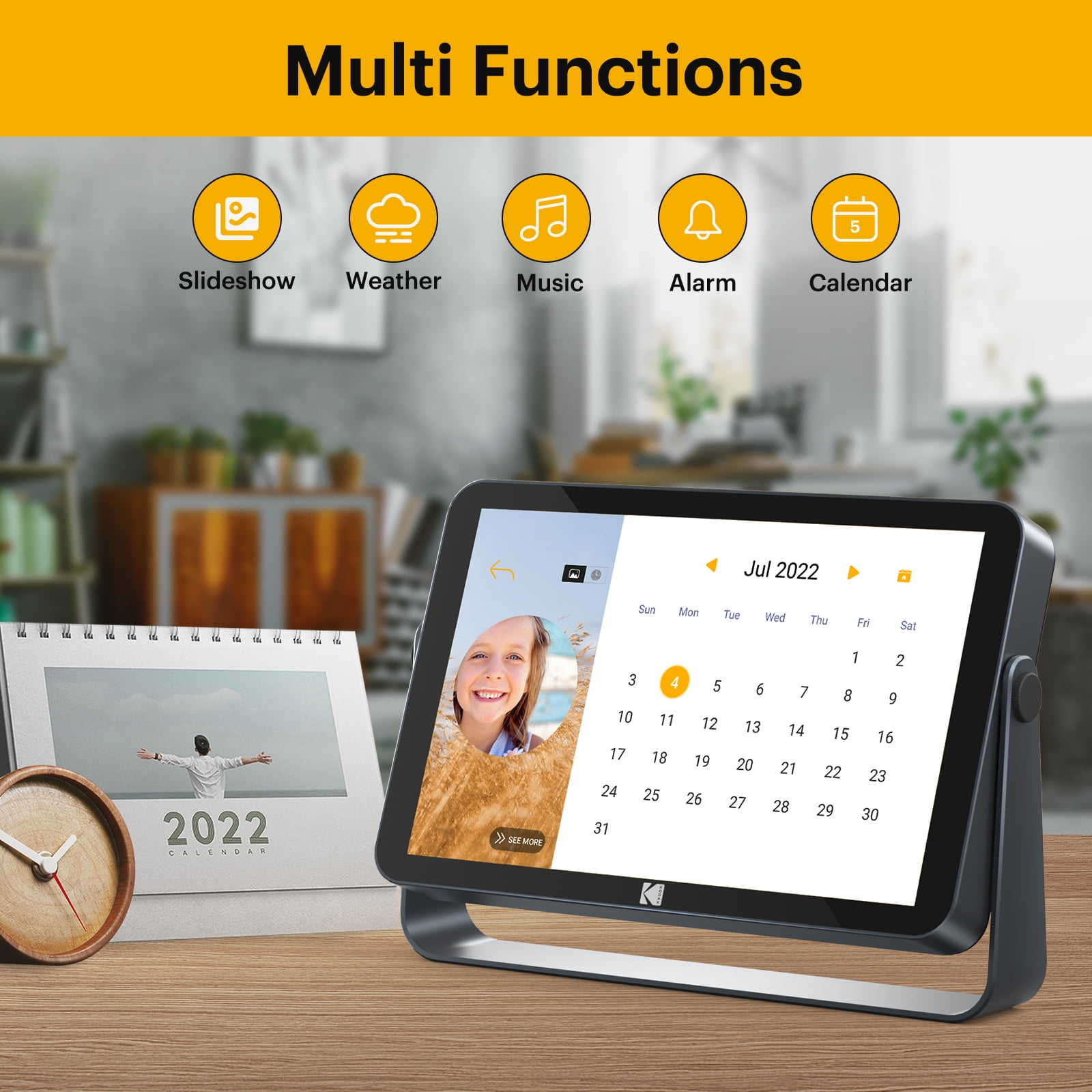 1920×1200 IPS TOUCH SCREEN, AMAZING IMAGE QUALITY: This high-resolution smart frame can display more clear, faster response than the normal screen, and scratch resistance. Browse through photos, delete videos, or pause the slideshow, with a quick tap of the finger. 4-6 HOURS LONG LASTING BATTERY, MORE CONVENIENT: With a built-in 4000mAh battery, this Wi-Fi Digital Picture Frame is potable to use, you can share the photos and videos with your friends or family in anywhere and anytime. 32GB MEMORY, HUGE STORAGE ROOM: This digital photo frame offers a BIG storage space to store around 80000+ Photos. Also, support max 64GB SD card or USB driver for import photos. Supports JPG/JPEG/BMP/PNG picture format and MP4 video format. SHARE PHOTOS AND VIDEOS VIA KODAK APP, EASY TO USE: Just download the Kodak app, connect the frame with WIFI, then you can upload photos and short videos. Or you can also email photos to the frame. 2.4Ghz WIFI networks, invite unlimited friends and family to share photos and videos via KODAK APP (iOS and Android). MULTI-FUNCTIONS: Our digital photo frame can automatically rotate photos to adjust the direction, allowing you to view the photos in either portrait or landscape mode. With 360° rotating bracket can meet any viewing angle requirement. Can be wall-mounted. Brightness and sleep mode can be adjusted in settings as you want. NO RISK PURCHASE & 1 YEAR LIMITED WARRANTY: Our factory has strict standards for raw materials to ensure the quality of these digital photo frames. Also, we provide lifetime support, one-year limited warranty, prompt response within 24 hours. We have hundreds of thousands of happy customers. Please feel free to reach us for more information. AMAZING GIFTS: Kodak smart frames make a great gift for all ages and all occasions. All your precious and cherished moments can be displayed on the digital photo frame instead of just being locked inside your phone.