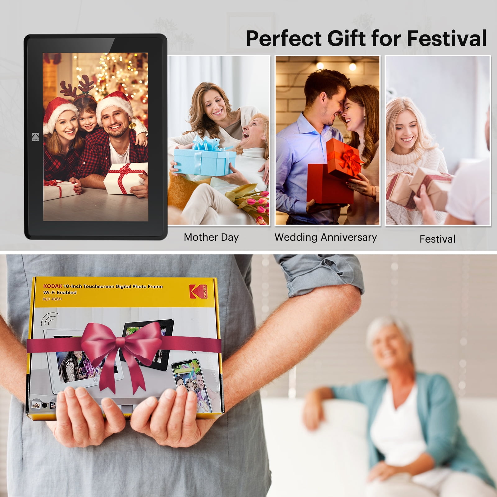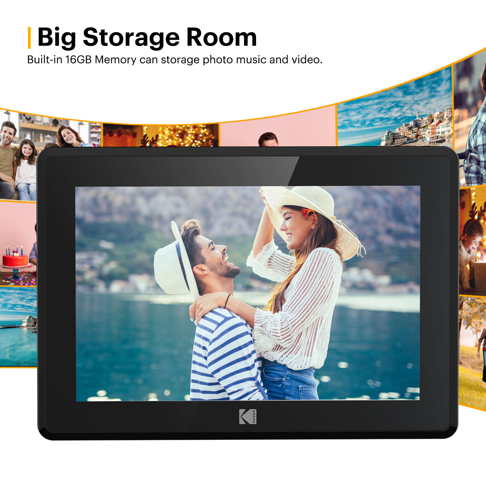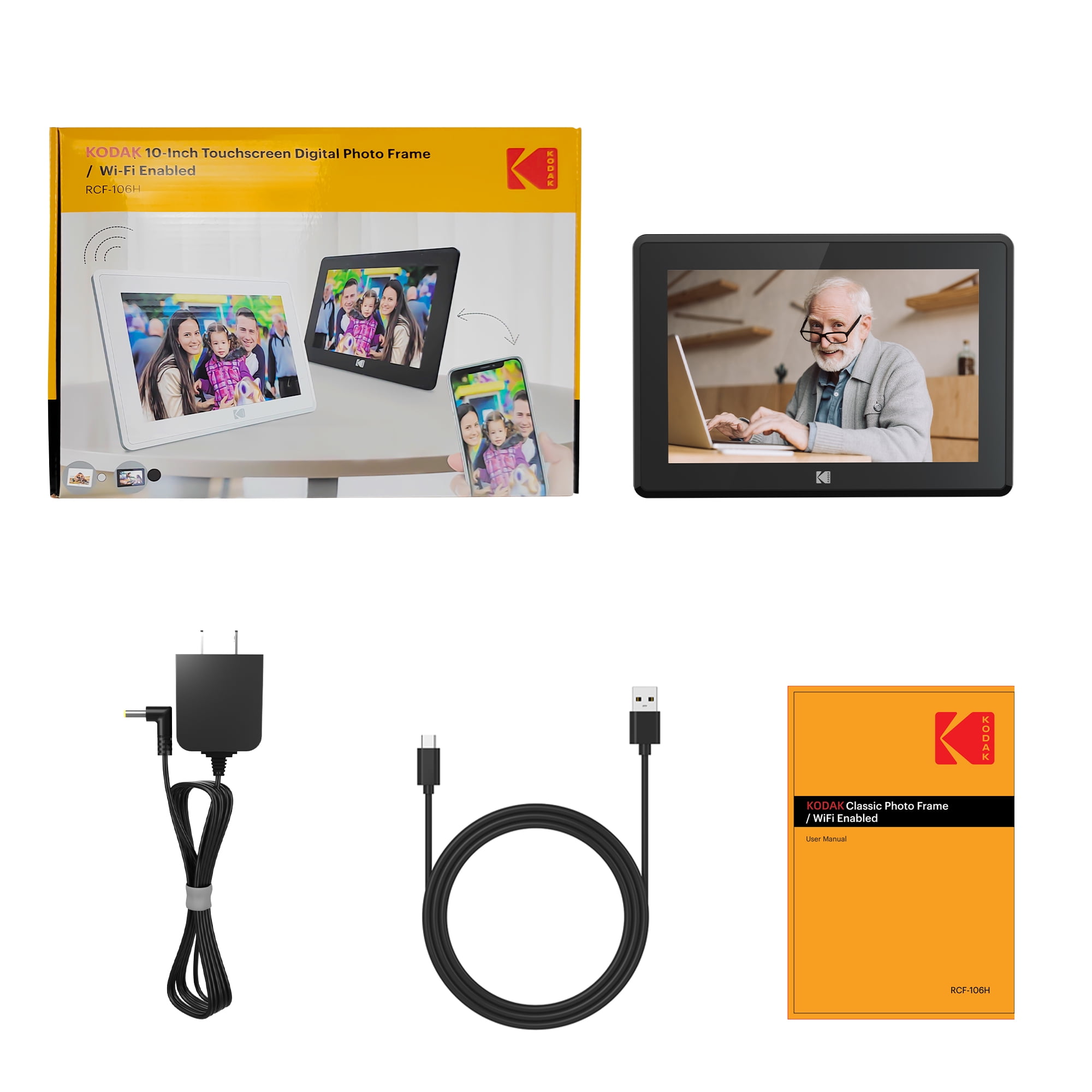 1280*800 RESOLUTION, IPS TOUCH SCREEN: Kodak has enabled the sharing of your memorable moments through this WIFI digital photo frame. High quality 10.1’’ touchscreen display with 1280*800 resolution (aspect ratio 16:10) is a great gift for new parents, grandparents, college kids or families separated by distance. NON-TECHIES FRIENDLY,EASY TO SET UP:Only a few steps to complete the setup. Just download the Kodak app, connect the frame with WIFI, then you can upload photos and short videos. Or you can also email photos to the frame. The Kodak App for iOS and Android gives you full control over your frame. 16GB MEMORY, HUGE STORAGE ROOM: 16GB internal memory will hold over 10,000 high resolution photos. Accepts both SD Cards and USB sticks for extended memory. Supports JPG/JPEG/BMP/PNG picture format and MP4 video format. MULTI-FUNCTIONS, MODERN DESIGN: Our digital photo frame can automatically rotate photos to adjust the direction, allowing you to view the photos in either portrait or landscape mode. Can be wall-mounted. Brightness and sleep mode can be adjusted in settings as you want. The built-in speaker supports photo slideshow with background music. NO RISK PURCHASE & 1 YEAR LIMITED WARRANTY: Our factory has strict standards for raw materials to ensure the quality of these digital photo frames. Also, we provide lifetime support, one-year limited warranty, prompt response within 24 hours. We have hundreds of thousands of happy customers. Please feel free to reach us for more information. AMAZING GIFTS: Kodak smart frames make a great gift for all ages and all occasions. All your precious and cherished moments can be displayed on the digital photo frame instead of just being locked inside your phone.