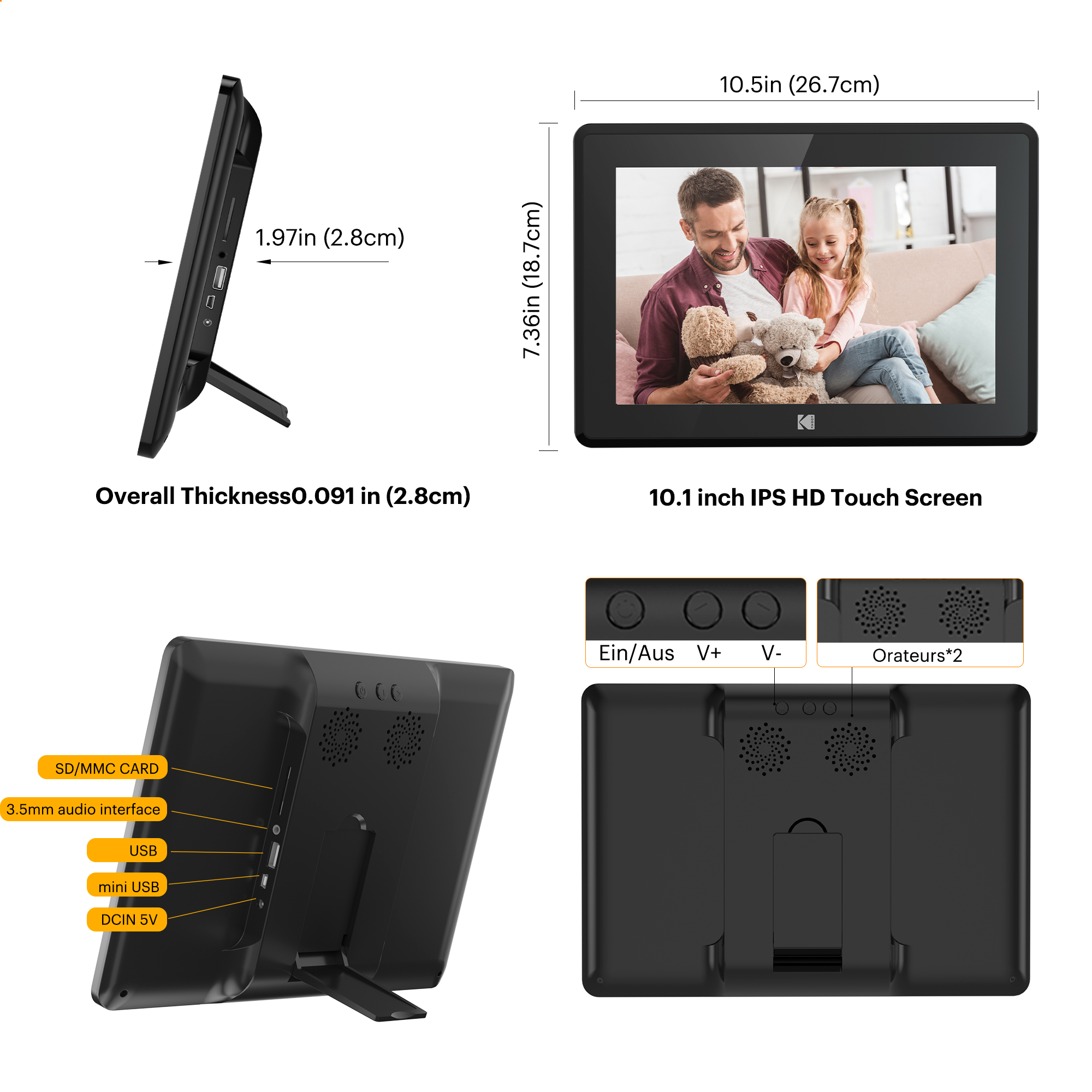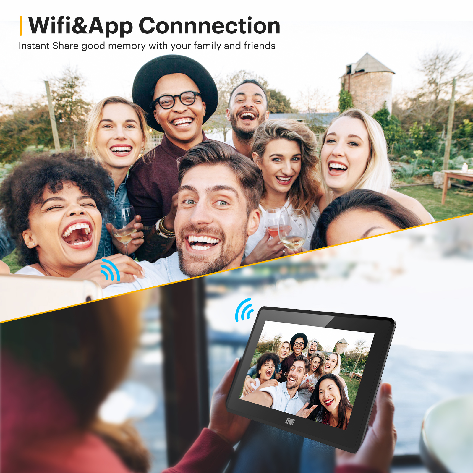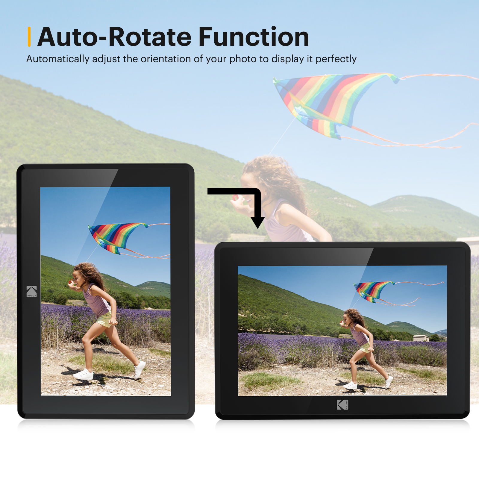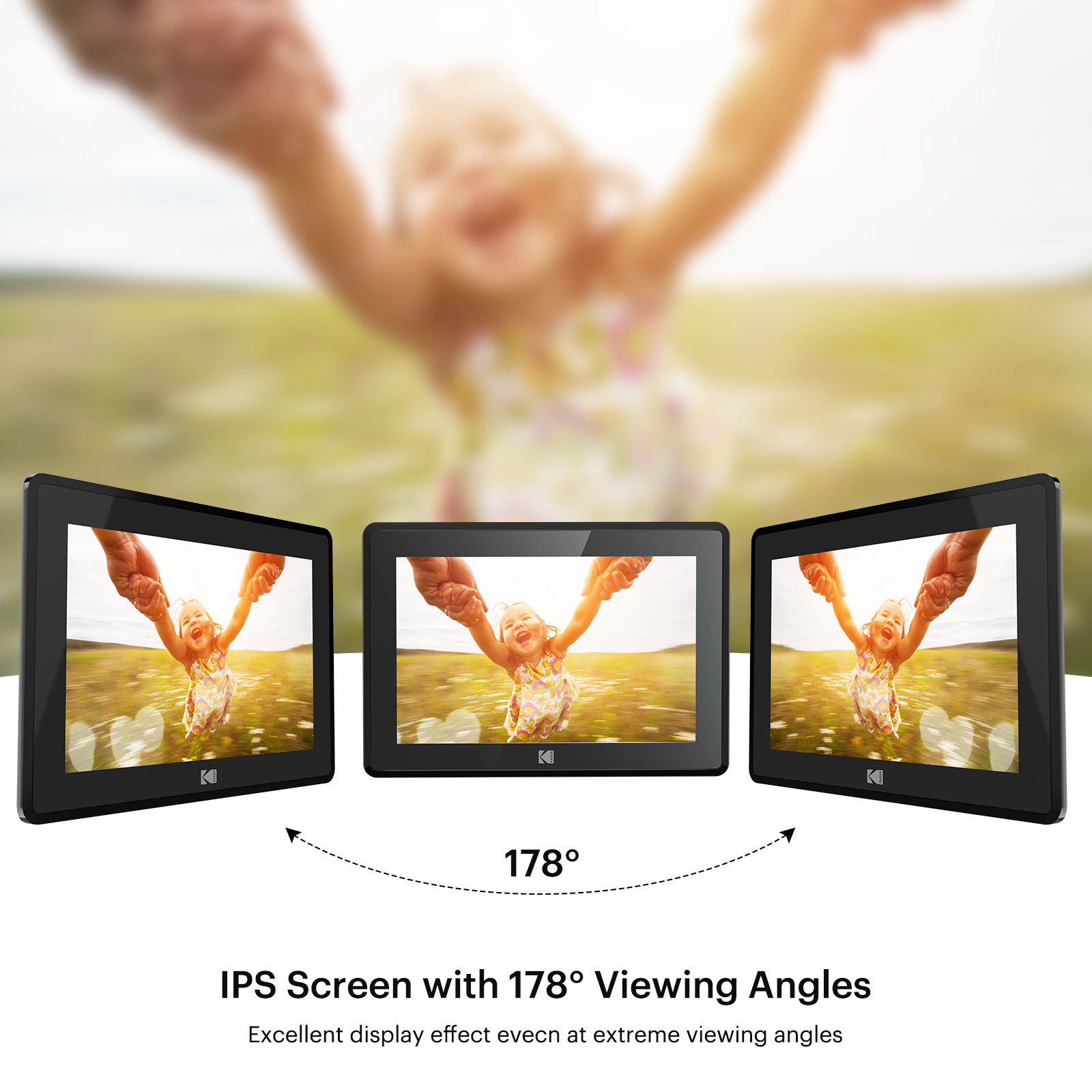 1280*800 RESOLUTION, IPS TOUCH SCREEN: Kodak has enabled the sharing of your memorable moments through this WIFI digital photo frame. High quality 10.1’’ touchscreen display with 1280*800 resolution (aspect ratio 16:10) is a great gift for new parents, grandparents, college kids or families separated by distance. NON-TECHIES FRIENDLY,EASY TO SET UP:Only a few steps to complete the setup. Just download the Kodak app, connect the frame with WIFI, then you can upload photos and short videos. Or you can also email photos to the frame. The Kodak App for iOS and Android gives you full control over your frame. 16GB MEMORY, HUGE STORAGE ROOM: 16GB internal memory will hold over 10,000 high resolution photos. Accepts both SD Cards and USB sticks for extended memory. Supports JPG/JPEG/BMP/PNG picture format and MP4 video format. MULTI-FUNCTIONS, MODERN DESIGN: Our digital photo frame can automatically rotate photos to adjust the direction, allowing you to view the photos in either portrait or landscape mode. Can be wall-mounted. Brightness and sleep mode can be adjusted in settings as you want. The built-in speaker supports photo slideshow with background music. NO RISK PURCHASE & 1 YEAR LIMITED WARRANTY: Our factory has strict standards for raw materials to ensure the quality of these digital photo frames. Also, we provide lifetime support, one-year limited warranty, prompt response within 24 hours. We have hundreds of thousands of happy customers. Please feel free to reach us for more information. AMAZING GIFTS: Kodak smart frames make a great gift for all ages and all occasions. All your precious and cherished moments can be displayed on the digital photo frame instead of just being locked inside your phone.