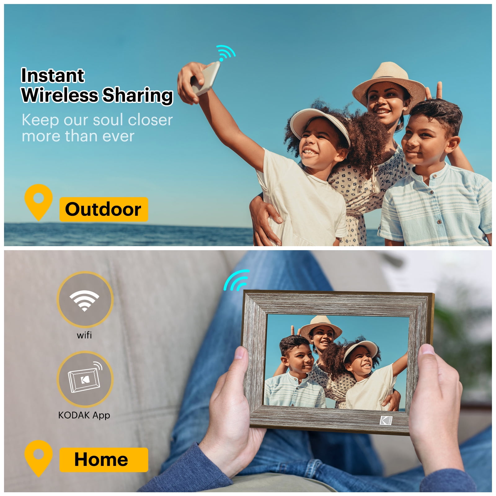 1280 x 800 Resolution, IPS Touch Screen: Kodak has enabled the sharing of your memorable moments through this WIFI digital photo frame. High high-quality 10.1’’ touchscreen display with 1280*800 resolution (aspect ratio 16:10) is a great gift for new parents, grandparents, college kids or families separated by distance Non-Techies Friendly, Easy to set up: Only a few steps to complete the setup. Download the Kodak app, connect the frame with WIFI, and then upload photos and short videos. You can also email photos to the frame. The Kodak App for iOS and Android gives you full control over your frame. 16GB Memory, huge Storage Room: 16GB internal memory will hold over 10,000 high-resolution photos. Accepts both SD Cards and USB sticks for extended memory. Supports JPG/JPEG/BMP/PNG picture format and MP4 video format. Multi-Functions, Solid Wood Design: Our digital photo frame can automatically rotate photos to adjust the direction, allowing you to view the photos in either portrait or landscape mode. Can be wall-mounted. Brightness and sleep mode can be adjusted in settings as you want. The built-in speaker supports photo slideshow with background music Amazing Gifts: Kodak smart frames make a great gift for all ages and all occasions. All your precious and cherished moments can be displayed on the digital photo frame instead of just being locked inside your phone