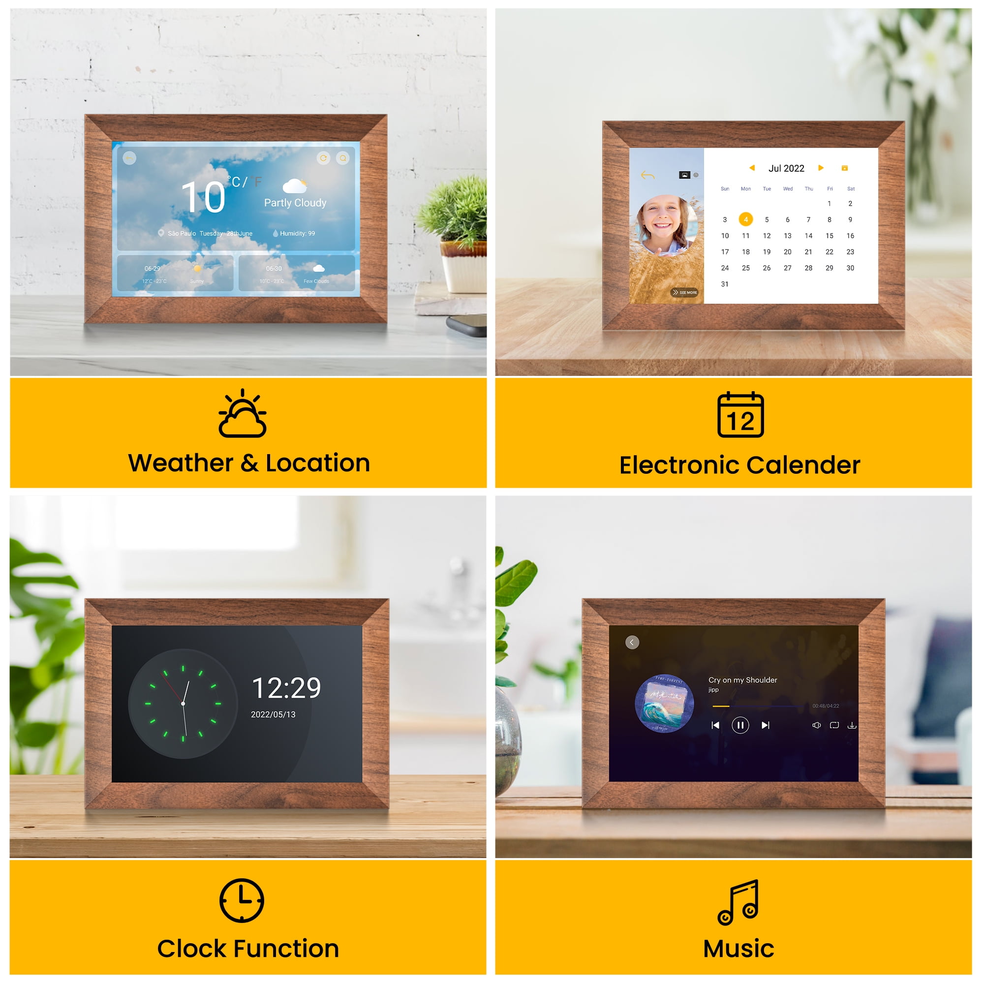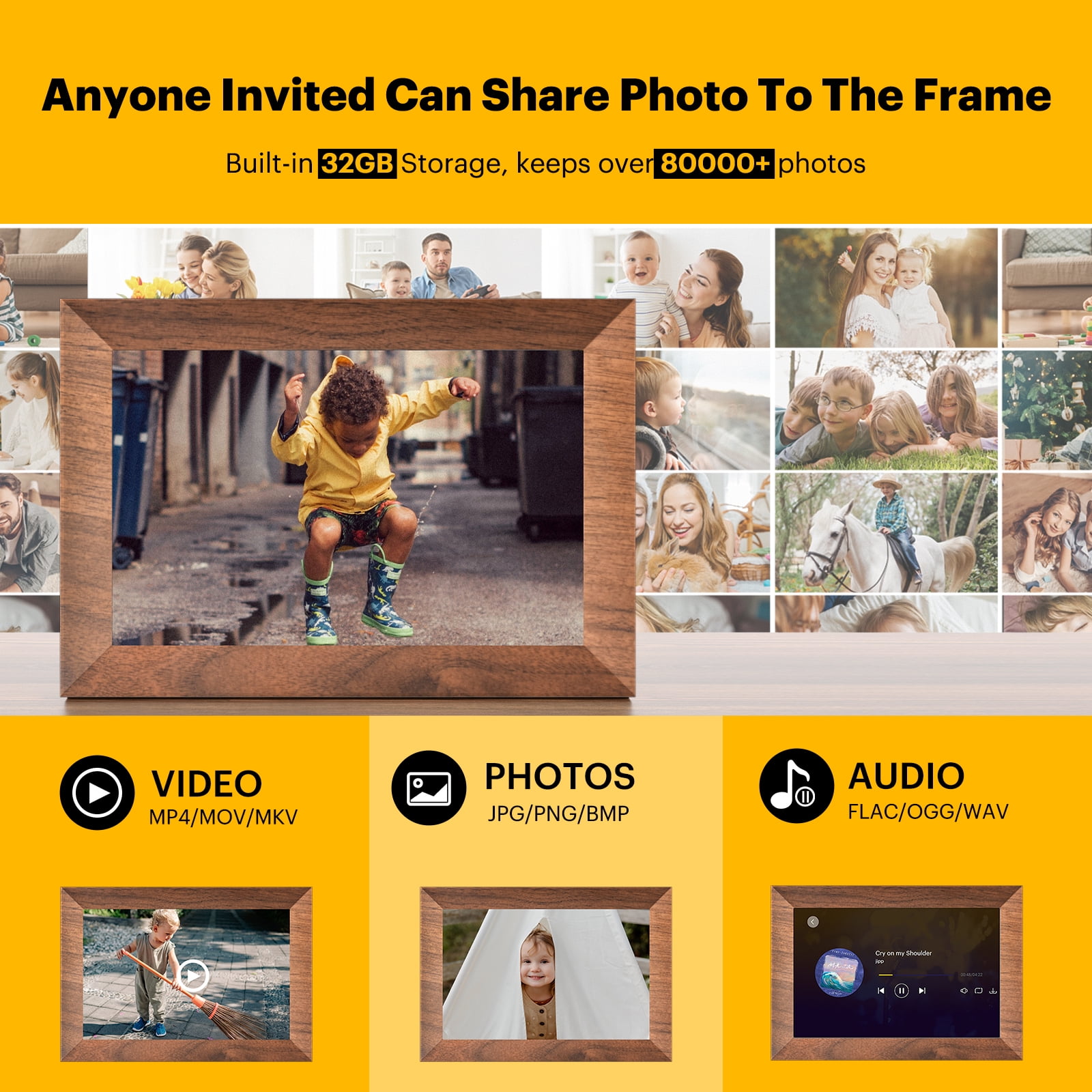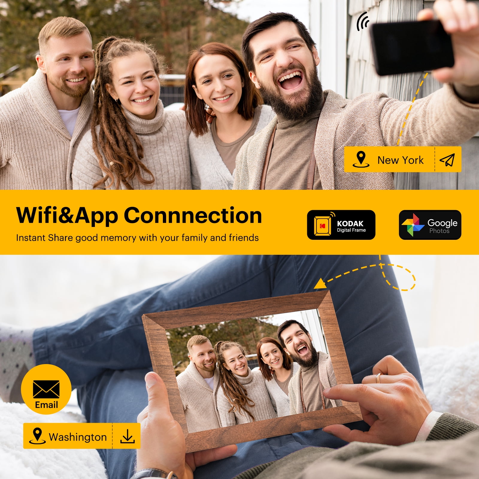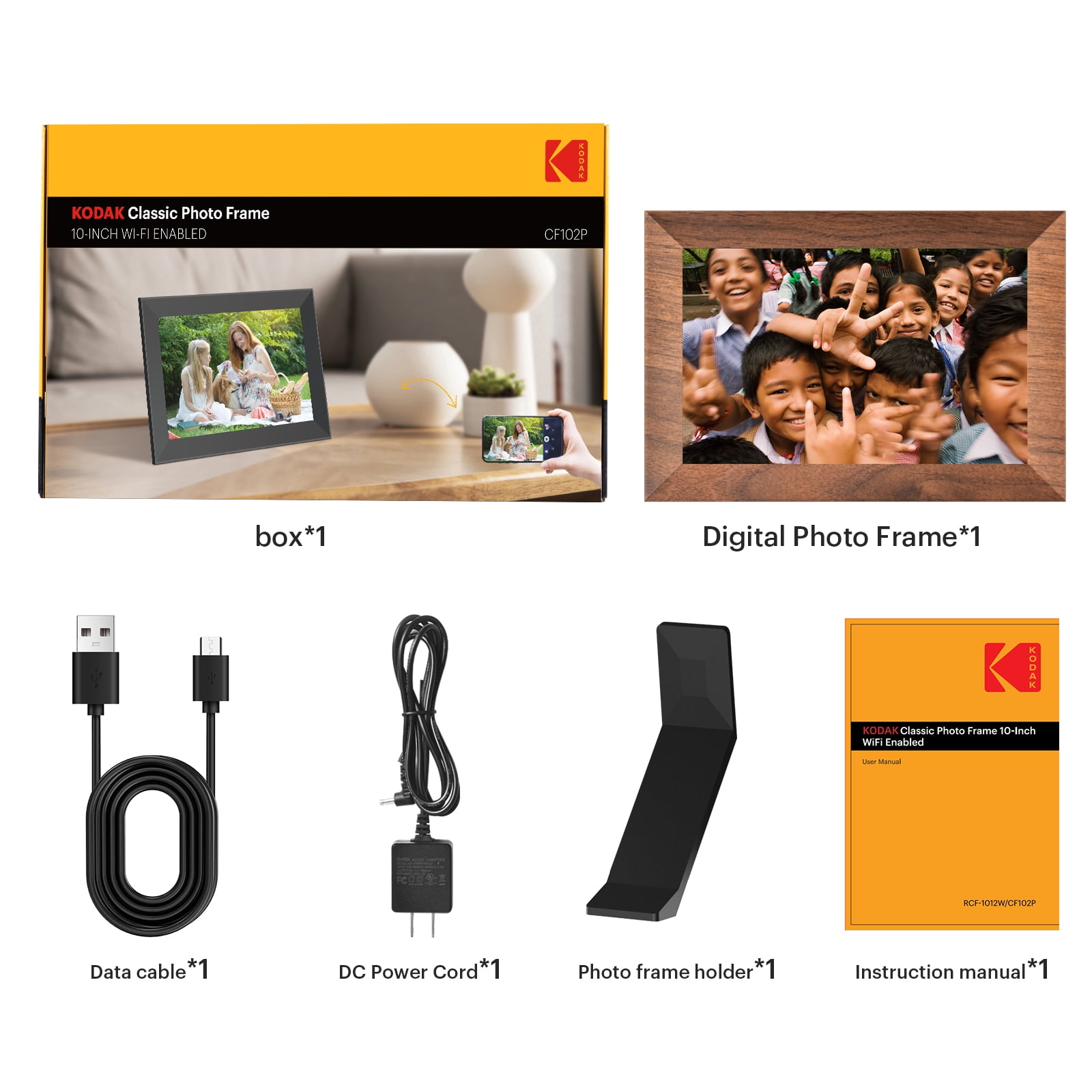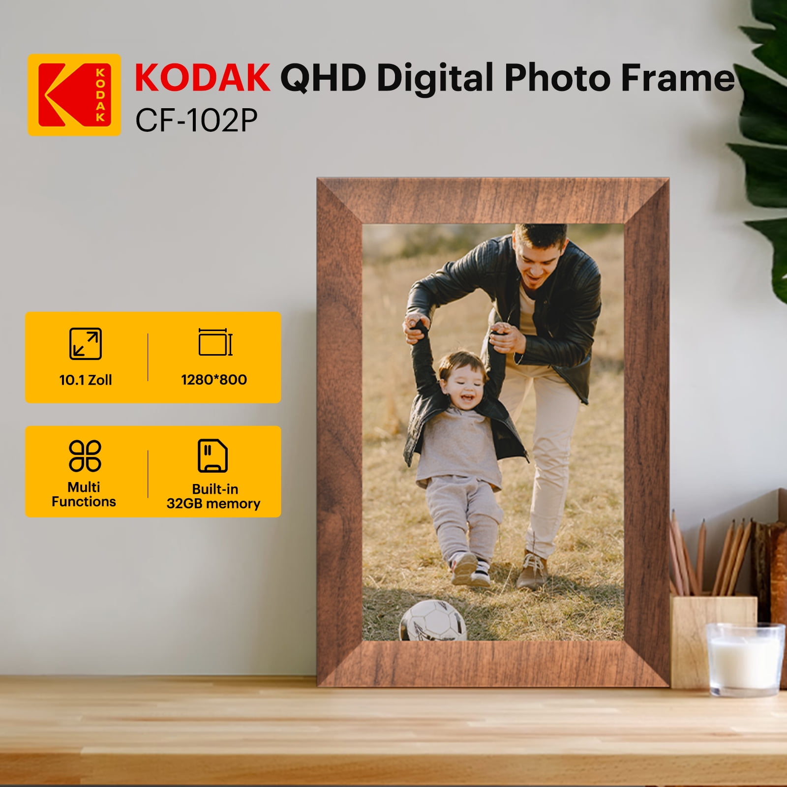 【10.1Inch IPS HD Touch Screen】: This digital picture frame has a high-definition full-view display with a resolution of 1280*800, allowing you to enjoy the most precious moments with a 180° ultra-wide viewing angle and accurate color reproduction. Touch screen design, is very suitable for elders, adjusting brightness and volume levels is as easy as sliding your finger up or down on the touchscreen. 【 Strong Memory】: This frame offers you a huge storage capacity with built-in 32GB memory (around 80,000 photos of 300KB/pc). It also supports the micro SD card and micro USB drive connectivity to enable you to read the files and export, and back up the received photos and videos for better album management.10GB cloud photo storage is included with every frame without extra fees. 【Auto rotation & impressive features】: When the digital photo frame is moved between portrait and landscape position, the screen automatically rotates, and you can choose the picture to either fit or fill the frame. Multi-functional custom settings, like display photo titles, slideshow mode, play order, instant/timed best wishes, weather/time setting, adjustable brightness/sound, etc. 【Wireless Sharing】: Connect this digital photo frame to Wi-Fi and sharing the wonderful moments through the free “KODAK APP” which available for both Android and iOS. You can send photos or small videos to the photo frame direct anytime anywhere, no need creating email account or no need Facebook. 【Perfect Gift for Anyone 】: This digital picture frame is a great gift for new parents, grandparents, newlyweds, college kids or families separated by distance on different holidays, such as Birthday, Anniversary, Mother’s day, Father’s day, Thanksgiving day, Christmas day. What a good way to make your loved ones accompany with you all the time. Note: Products with electrical plugs are designed for use in the US. Outlets and voltage differ internationally and this product may require an adapter or converter for use in your destination. Please check compatibility before purchasing.