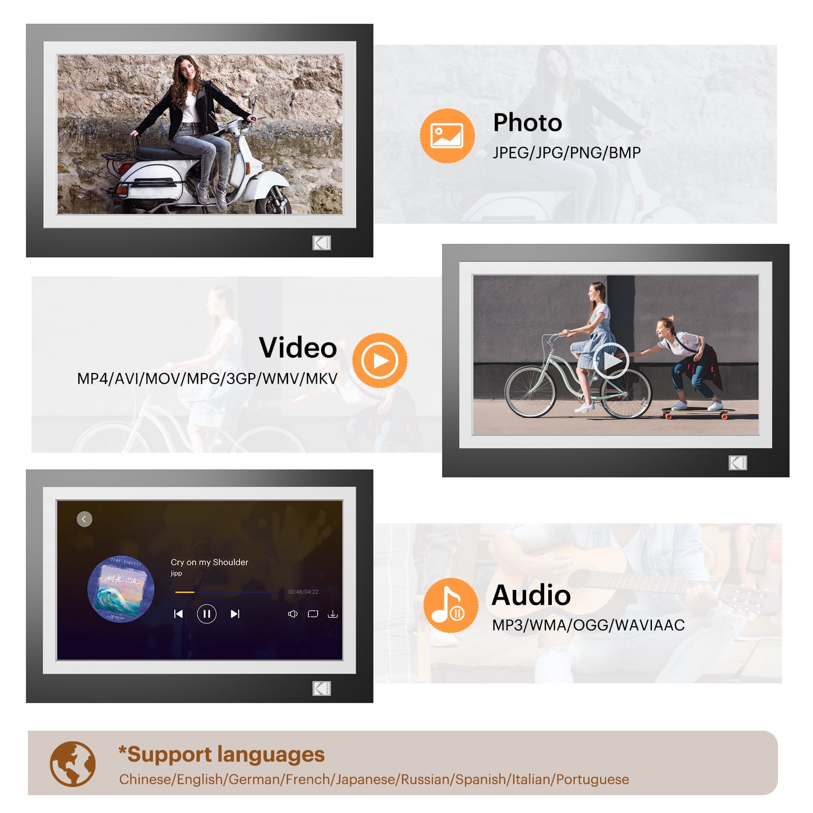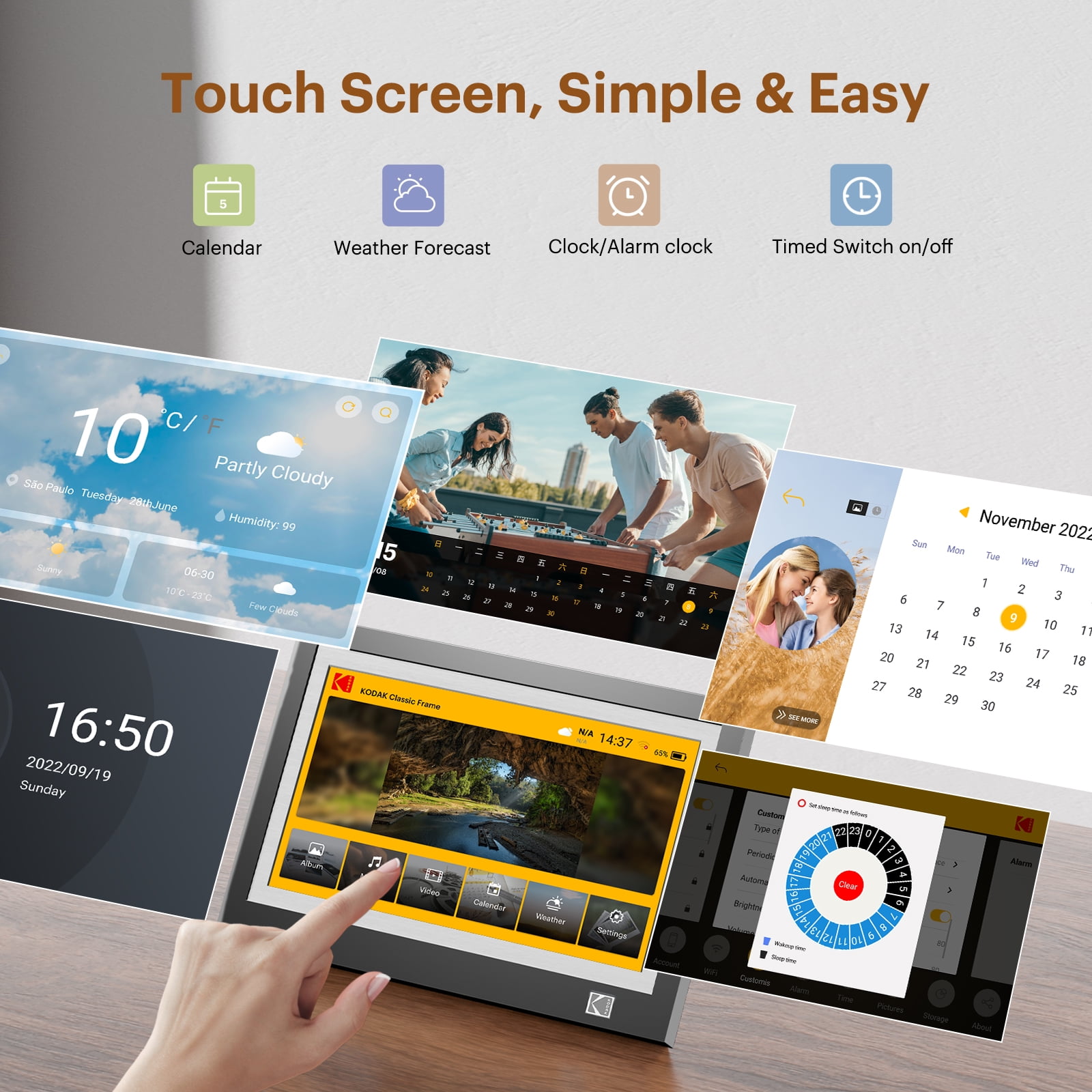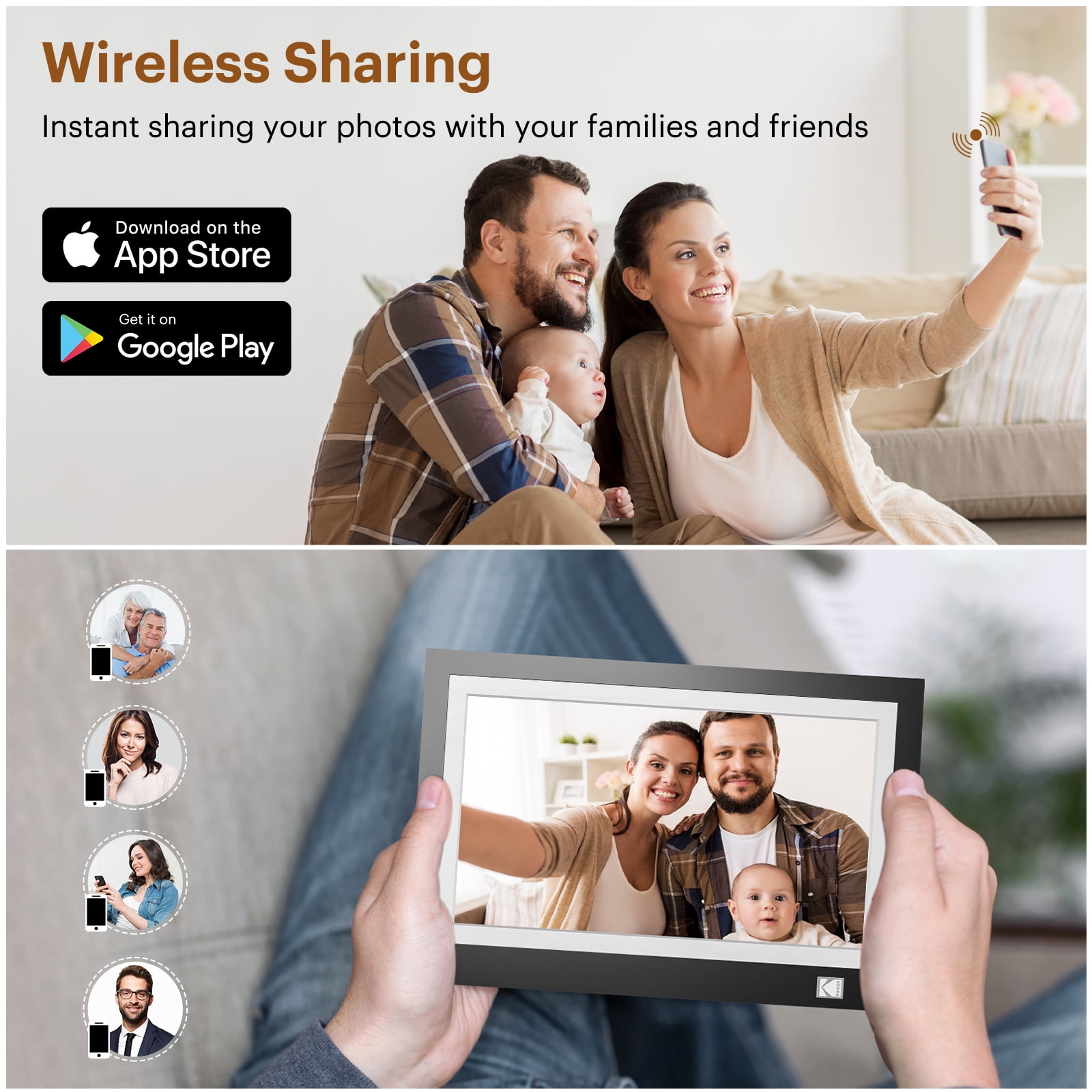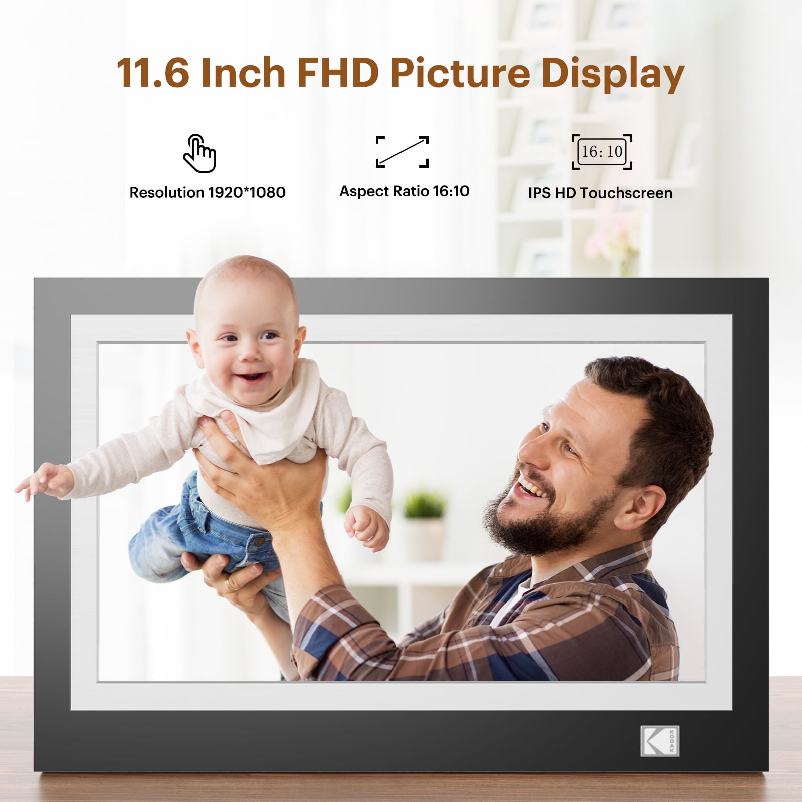 1920 x 1200 Resolution, G+G Touch Screen: Kodak has enabled the sharing of your memorable moments through this WIFI digital photo frame. A high-quality 11.6-inch touchscreen display with 1920 x 1200 resolution (aspect ratio 16:9) is a great gift for new parents, grandparents, college kids or families separated by distance Non-Techies Friendly, Easy to Set up: Only a few steps to complete the setup. Just download the Kodak app, connect the frame to WIFI, and then you can upload photos and short videos. You can also email photos to the frame. The Kodak App for iOS and Android gives you full control over your frame 32GB Memory, Huge Storage Room: This digital photo frame offers a BIG storage space to store around 80000+ Photos. It also supports max 64GB SD card or USB driver for importing photos. Supports JPG/JPEG/BMP/PNG picture format and MP4 video format. Multi-Functions, Solid Wood Design: Our digital photo frame can automatically rotate photos to adjust the direction, allowing you to view the photos in either portrait or landscape mode. Can be wall-mounted. Brightness and sleep mode can be adjusted in settings as you want. The built-in speaker supports photo slideshow with background music Amazing Gifts: Kodak smart frames make a great gift for all ages and all occasions. All your precious and cherished moments can be displayed on the digital photo frame instead of just being locked inside your phone.
