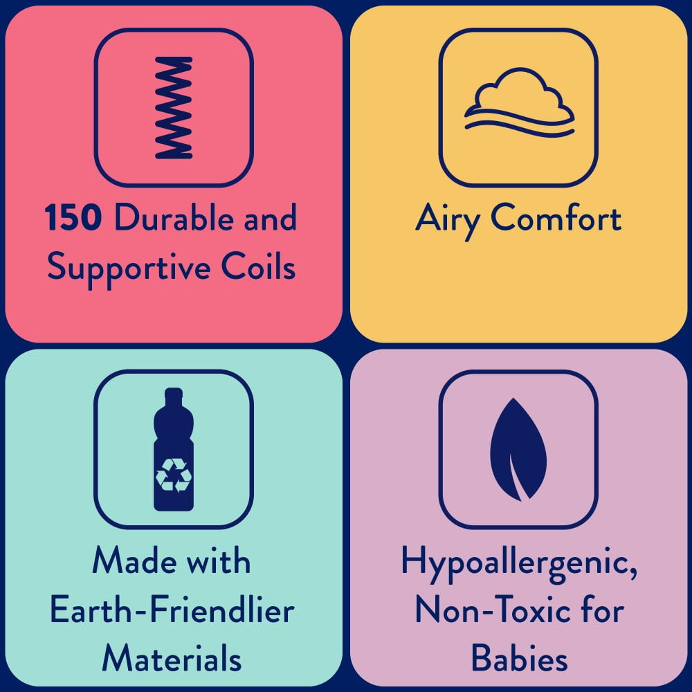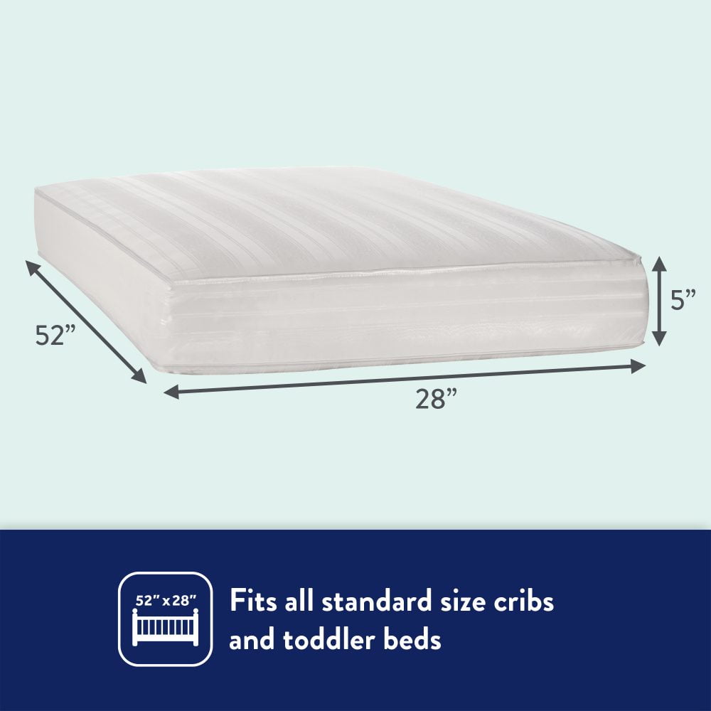 150 heavy-gauge steel coils for firm support throughout the sleeping surface Firm and comfortable hypoallergenic cushioning Measures 51.63″ x 27.25″ x 5.25″ to fit snugly in cribs and also fits toddler bed frames GREENGUARD Gold Certified — the higher GOLD standard means this entire crib mattress has been tested to stricter standards for indoor air quality a help create a healthier sleeping environment for your baby Ten-year warranty on workmanship and materials Passes quality and safety standards including crib fit testing, durability, air quality and ASTM crib mattress safety standards Beds sold separately. See our assortment of beds. Bed frames sold separately. See our assortment of bed frames. Great for platform beds. Requires foundation or box spring with standard bed frames. Foundations sold separately. See our assortment of foundations.