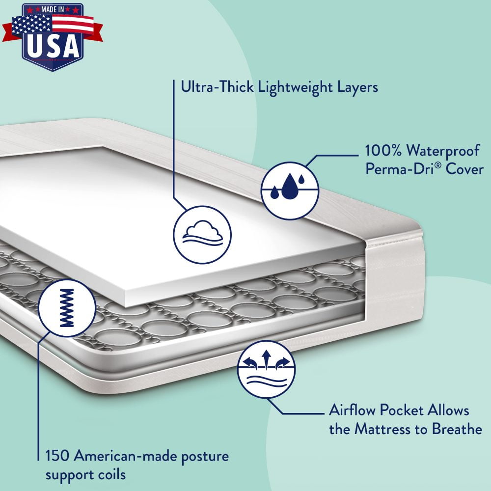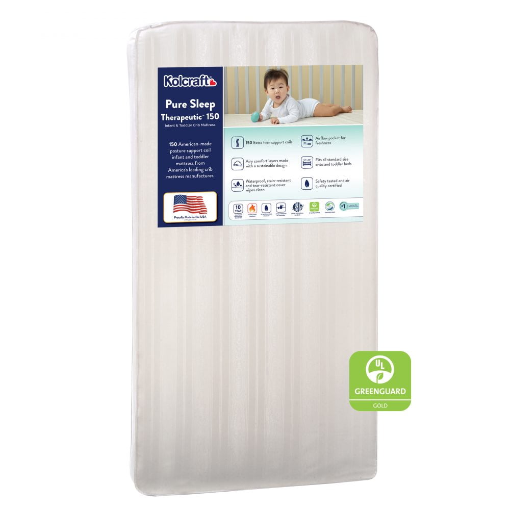 Kolcraft is a family owned and operated baby gear company. The Kolcraft Pure Sleep Therapeutic 150 crib mattress is an extra firm baby and toddler mattress with 150 durable coil springs, a waterproof surface and comfy cushioning throughout. The entire mattress passes GREENGUARD GOLD certification and ASTM crib mattress standards helping to ensure top quality and safety features. The mattress core is durability tested for years of use and carries a 10 year warranty on workmanship and materials. Use this mattress in your infant’s crib as well as your child’s toddler bed as he or she grows. The waterproof cover is reinforced to help prevent tearing and the entire surface and lock-stitched binding won’t allow leaks to seep inside the mattress surface. This offers an easy-clean, wipe-clean surface.