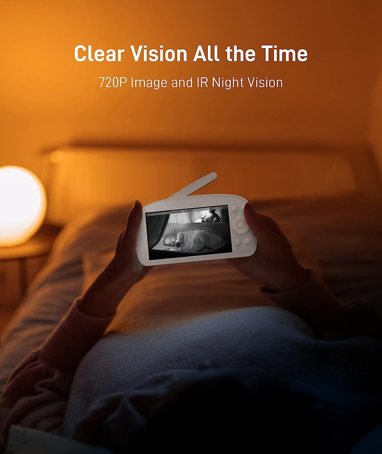 Nurturing Reminder; Temperature check; 8 optional lullabies; 5.5′ Large screen; 720P HD picture; Sound detection;
