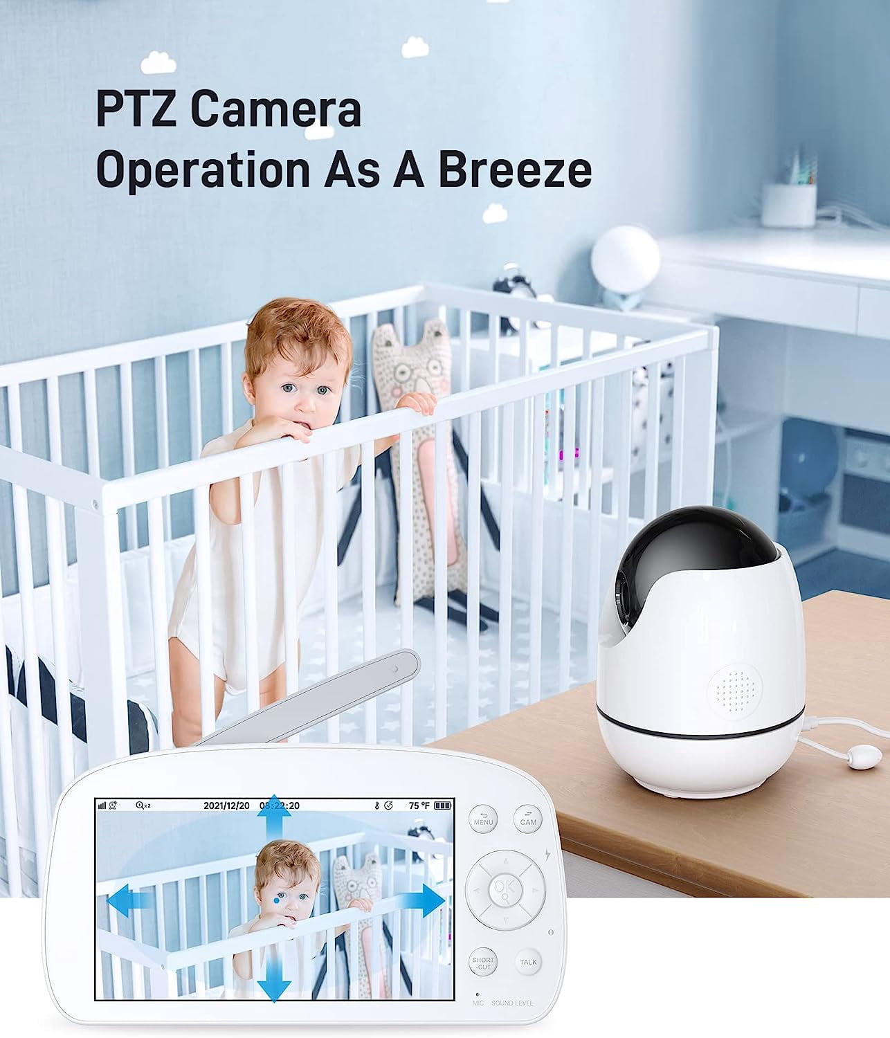 Excellent Operation Experience Featuring 5.5′ large screen and 720P clear image, this baby video monitor provides you with every detail of your adorable baby and eyes protection. The monitor buttons made of soft silicone nearly produce no sounds when processed. A quiet, excellent baby video monitor for you to look after your baby. Under Control Still worrying about your baby when you’re moment away? This baby video monitor without Wi-Fi helps you check your baby’s room remotely by adjusting the view angle. Pan: 355°, tilt: 90°, zoom:4X. Featureing with 8 IR LEDs, clear night vision available. Long Standby Time With 5000mAh rechargeable battery, this baby monitor with video and audio will last up to 10 hrs when it’s ECO mode, up to 20 hrs when monitoring turned off. Care about Your Baby Featuring with 2-way audio and temperature alarm function, new parents will find this baby video monitor a good nanny to care about their babies. 4 optional soothing lullaby songs available. No Wi-Fi or App Pairing Transmitted via secured internal 2.4 GHz channel, this baby video monitor needs no Wi-fi or app pairing when monitoring, guaranteeing your privacy. The operation range is up to 1,000 feet, available for you to stay connected with your baby from room to room. Plug-in and Monitor The monitor and the camera are configured for monitoring right out of the box – no pairing or connections required. The camera can be set on desk top or wall mounted.