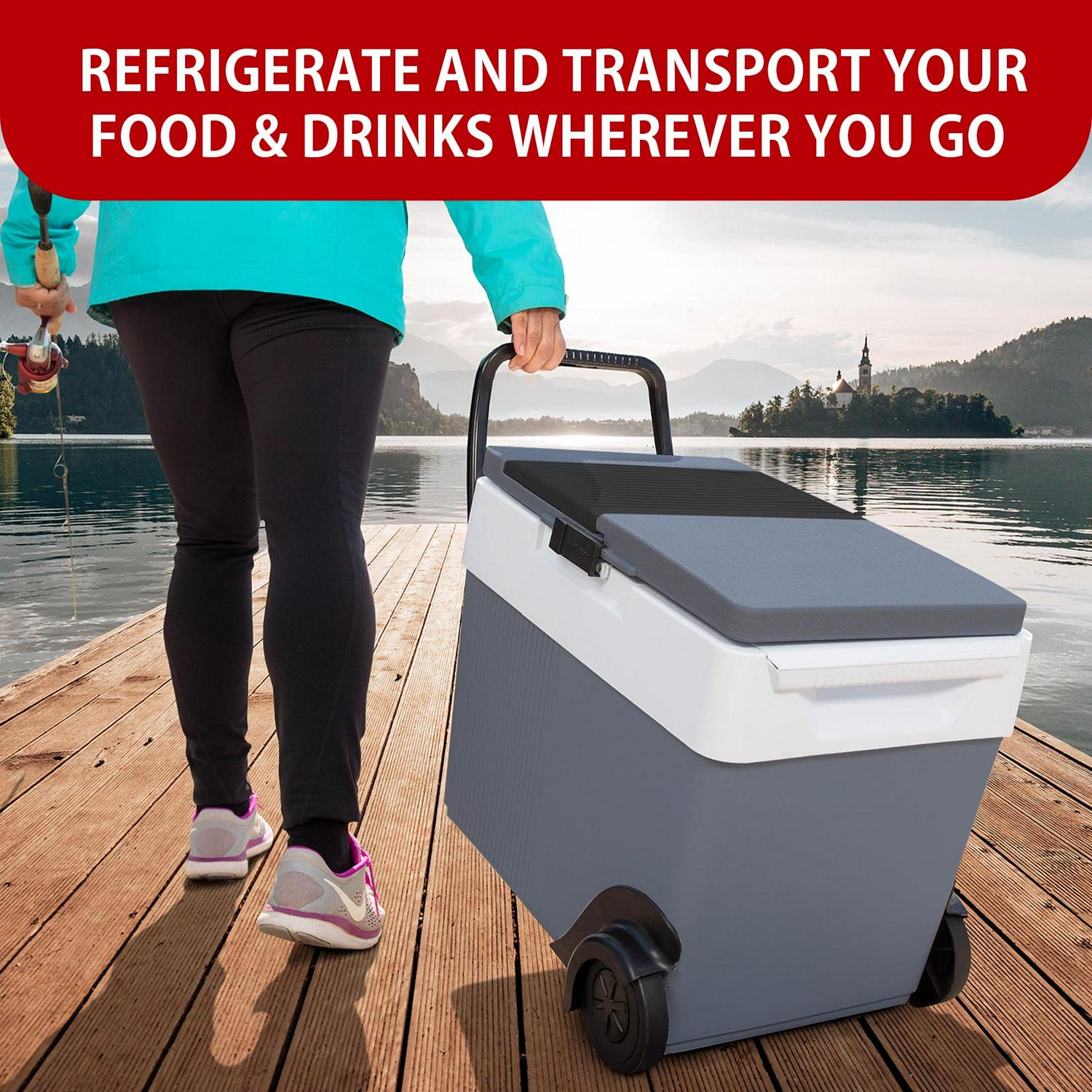 - Features: Wheeled electric travel cooler with split lid and cigarette-lighter adapter