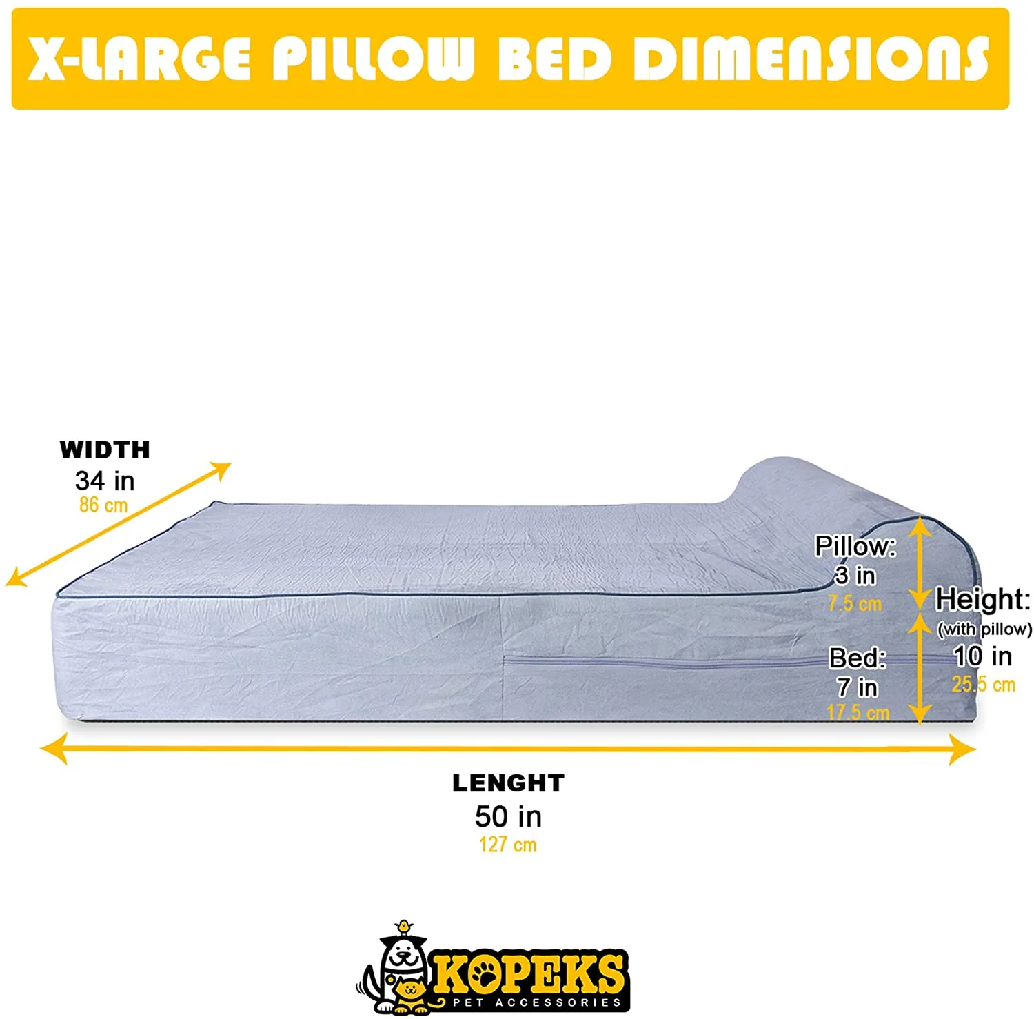 Kopeks Orthopedic Memory Foam Waterproof Dog Bed with Pillow, X-Large, 50″L x 34″W x 10″H, Gray: Waterproof dog bed with double-layer protection interior cover 7″ thick orthopedic memory foam with a waterproof fabric zippered cover Exterior cover: soft, plush suede with an anti-slip bottom Premium memory foam: hypo-allergenic, comparable to therapeutic foam found in high-end mattresses Dimensions: 50″L x 34″W x 7″D Kopeks dog bed with 3″D pillow Ideal for pets with arthritis or joint and muscle issues Dogs spend more than half their life sleeping, a Kopeks memory foam bed will immediately become their favorite spot