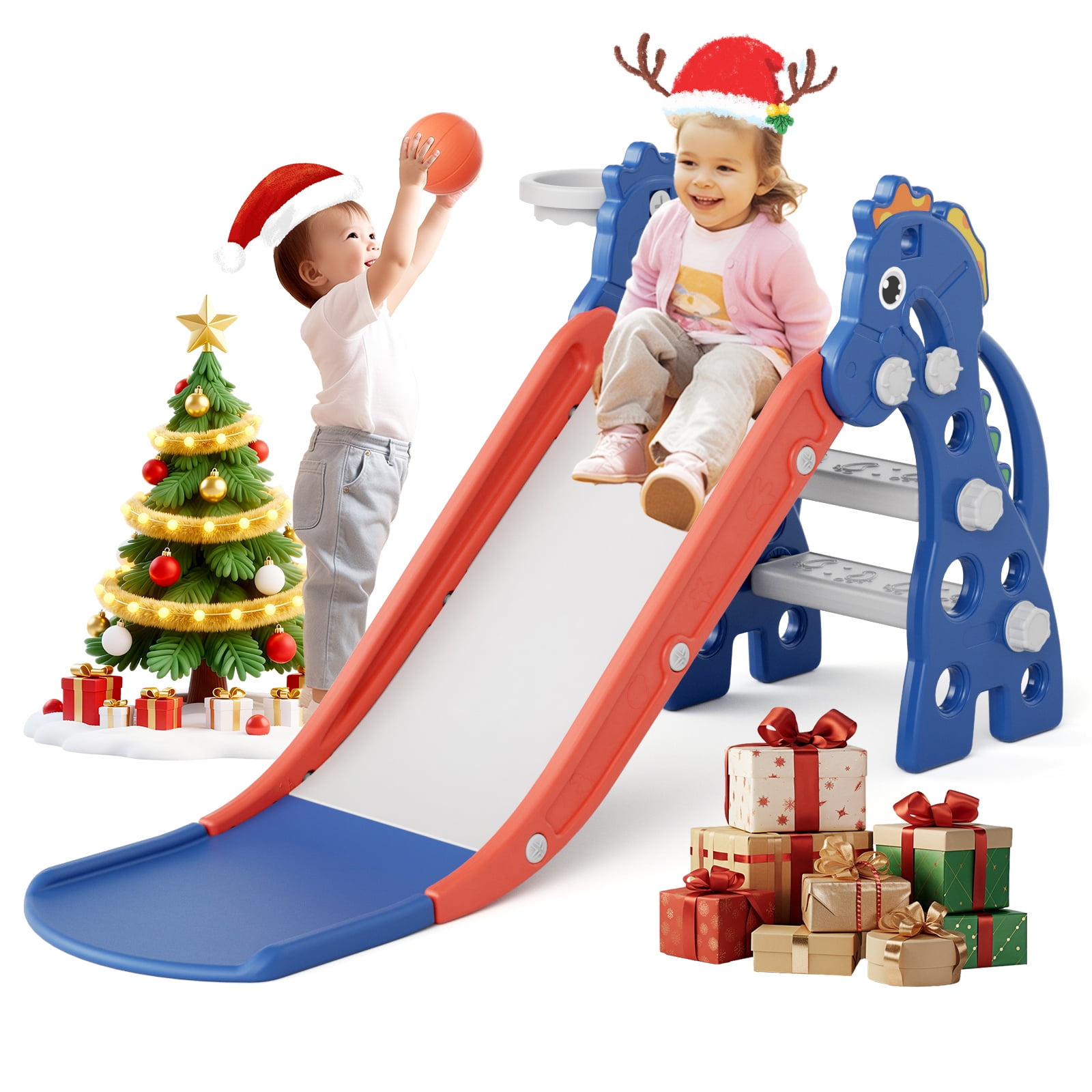 【Adorable Design】This slide set with bright colors and cute horse will make your kid fall in love with it at a glance. Besides, the lightweight design allows you to move it effortlessly to place in the kid’s playroom, living room or backyard. 【Amusing Sports】There are basketball hoop and throwing game on both sides of the kid slide, and rings are provided. Provide an indoor playground for your baby or outdoor backyard playset. 【Humanized Safety Design】Every step has a non-slip pattern and a reasonable foot lift height that allows your baby to easily reach the spacious top. Plus, 2 easy-to-grip slideway handrails and a bottom buffer zone help your little one fall and land safely. 【Sturdy & Stable Structure】The toddler plastic slides is made of non-toxic HDEP, which is not easy to deform after long-term use. Designed with a sturdy base and smooth surface, allow children to play . 【Foldable Kids Indoor Slide Design】 This toddler foldable slides are light, easy to carry or store, easy to move indoors and outdoors, and saving storage space. 【Easy to Assemble & Clean】No tools required, this toddler slide set can be done in minutes by one adult. It is very easy to clean and has folding capacity. It can be quickly disassembled when not in use for easy storage.