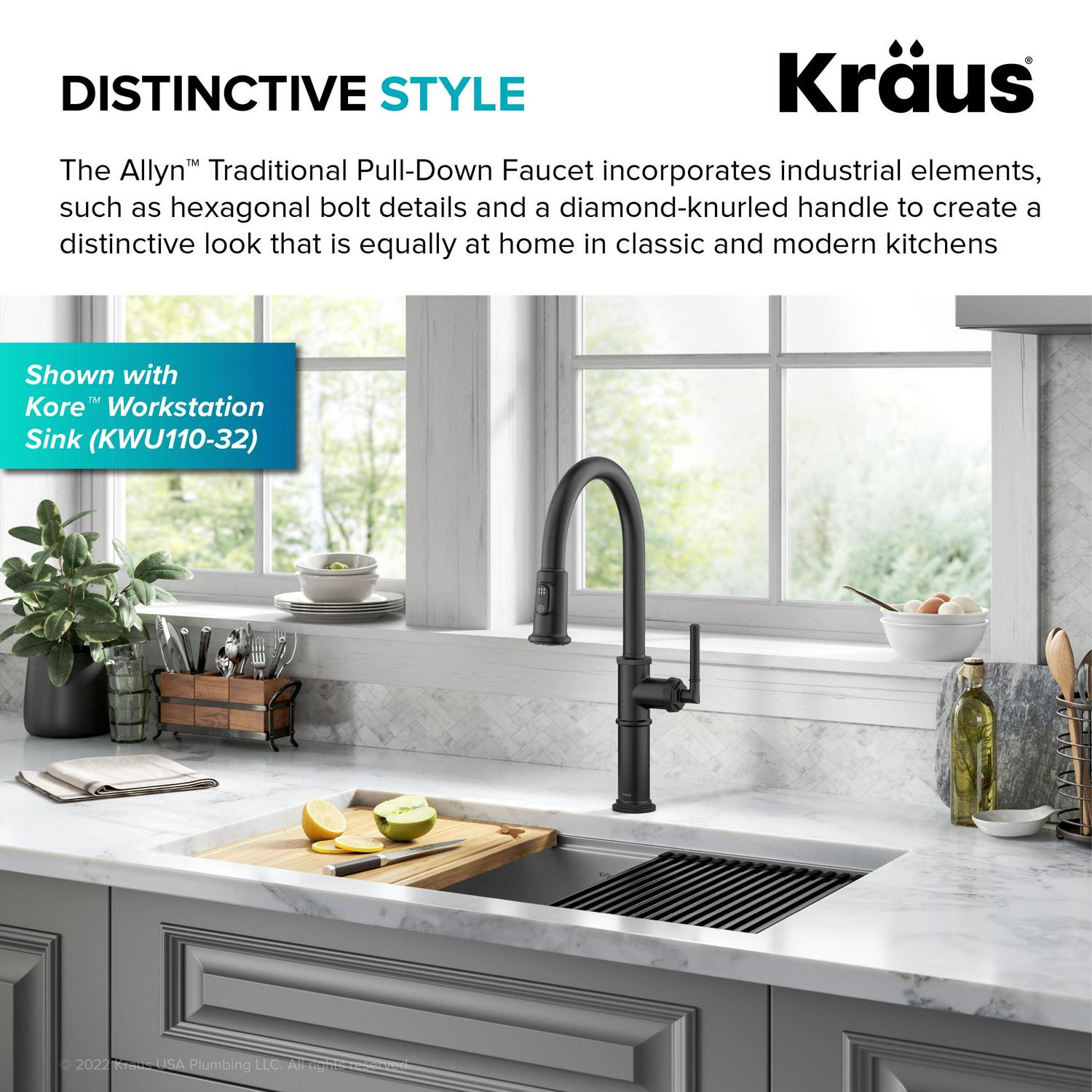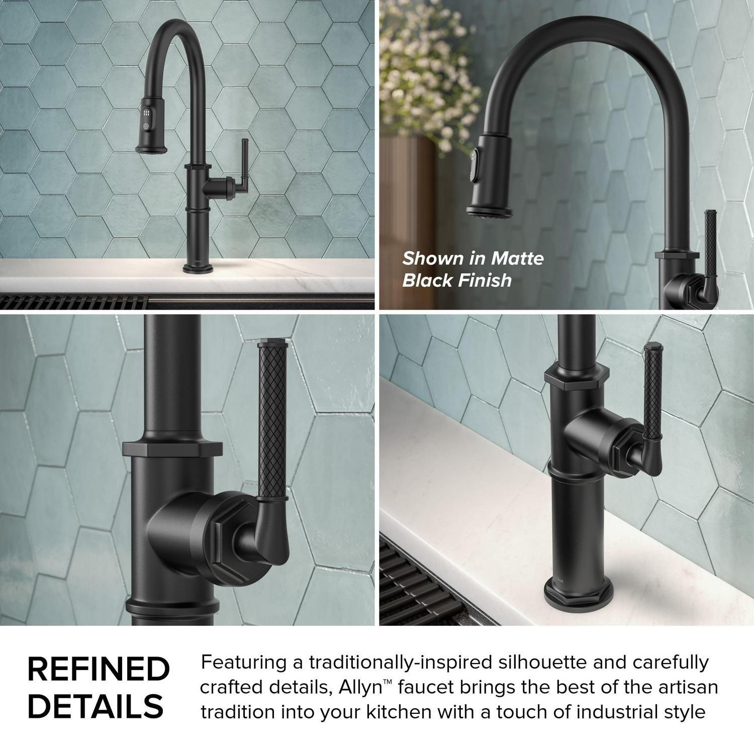 – Traditional Style with Industrial Details: The Allyn Faucet incorporates hexagonal bolt details and a diamond-knurled handle to create a distinctive look that’s equally at home in classic and modern kitchens