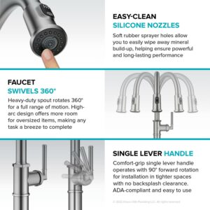 – High-arc spout offers ample room underneath the faucet for oversized items like tall pitchers, swivels 360° for a full range of motion