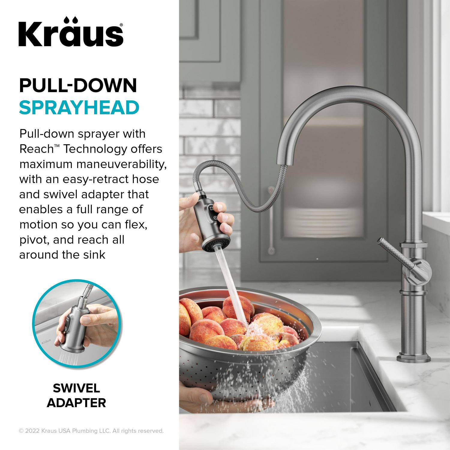 The wear-resistant finish is not prone to corrosion, fading, or tarnishing over time. Also available in Spot Free Stainless Steel Finish to help prevent water spots and fingerprints for easy maintenance. Knurled Handle Grip: The diamond texture on the faucet handle provides a non-slip grip while adding a touch of industrial style. Pull-down spray head with Reach Technology offers maximum maneuverability, with an easy-retract hose and swivel adapter that enables a full range of motion so you can flex, pivot, and reach all around the sink.