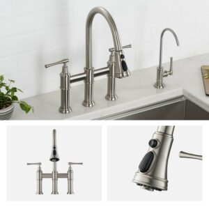 Corrosion-resistant finish will not fade or tarnish over time. Solid brass construction and top of the line components ensure long-lasting leak-free performance. Bridge faucet design with horizontal bar connects hot and cold water handles to the faucet spout for a bold classically-inspired look. Pull-down spray head provides flexibility for up-close tasks and extended reach all around the sink; eliminates the need for a separate side-sprayer. 3-function faucet: aerated stream and spray for everyday tasks, powerful blade function for heavy-duty rinsing. Gooseneck spout offers ample clearance for filling tall pitchers, swivels 360 degrees for a broad range of motion. Faucet comes with flexible pre-attached waterlines and quick connect sprayer hose for easy installation. Adjustable flow rate can be modified from 1.8 GPM to 2.2 GPM. Satisfaction guaranteed with top-rated customer service that puts you first