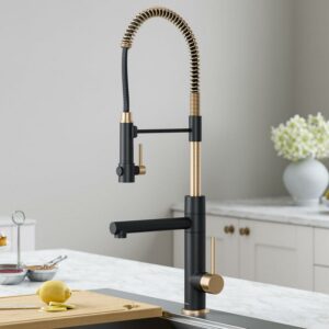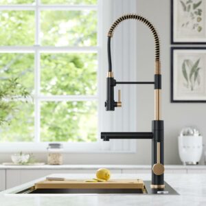 DURABLE ALL-METAL CONSTRUCTION with a metal body and stainless steel spring spout. SPOT-FREE Antique Champagne Bronze/Matte Black finish prevents water spots and fingerprints for a cleaner faucet, creating a high-end modern look. 2-FUNCTION FAUCET: Switch between pot filler and pre-rinse sprayer for a variety of kitchen tasks. ROTATABLE POT FILLER provides a soft aerated stream to easily fill large pots and pitchers, anti-clogging aerator ensures optimal splash-free performance. HIGH-ARC SPOUT WITH PRE-RINSE SPRAYER: Blast away tough residue using the powerful spray function. EASY-CLEAN NOZZLES: Soft rubber spray holes allow you to easily wipe away mineral build-up for long-lasting performance. MAGNETIC DOCKING: Sprayhead snaps into place for a secure hold. ADJUSTABLE FLOW RATE: FlexFlow technology allows you to increase the flow rate from 1.8 (CEC-compliant for California) to 2.2 GPM. SMART HANDLE DESIGN: Single handle operates with 100° forward rotation, allowing for installation in tighter spaces with no backsplash clearance needed
