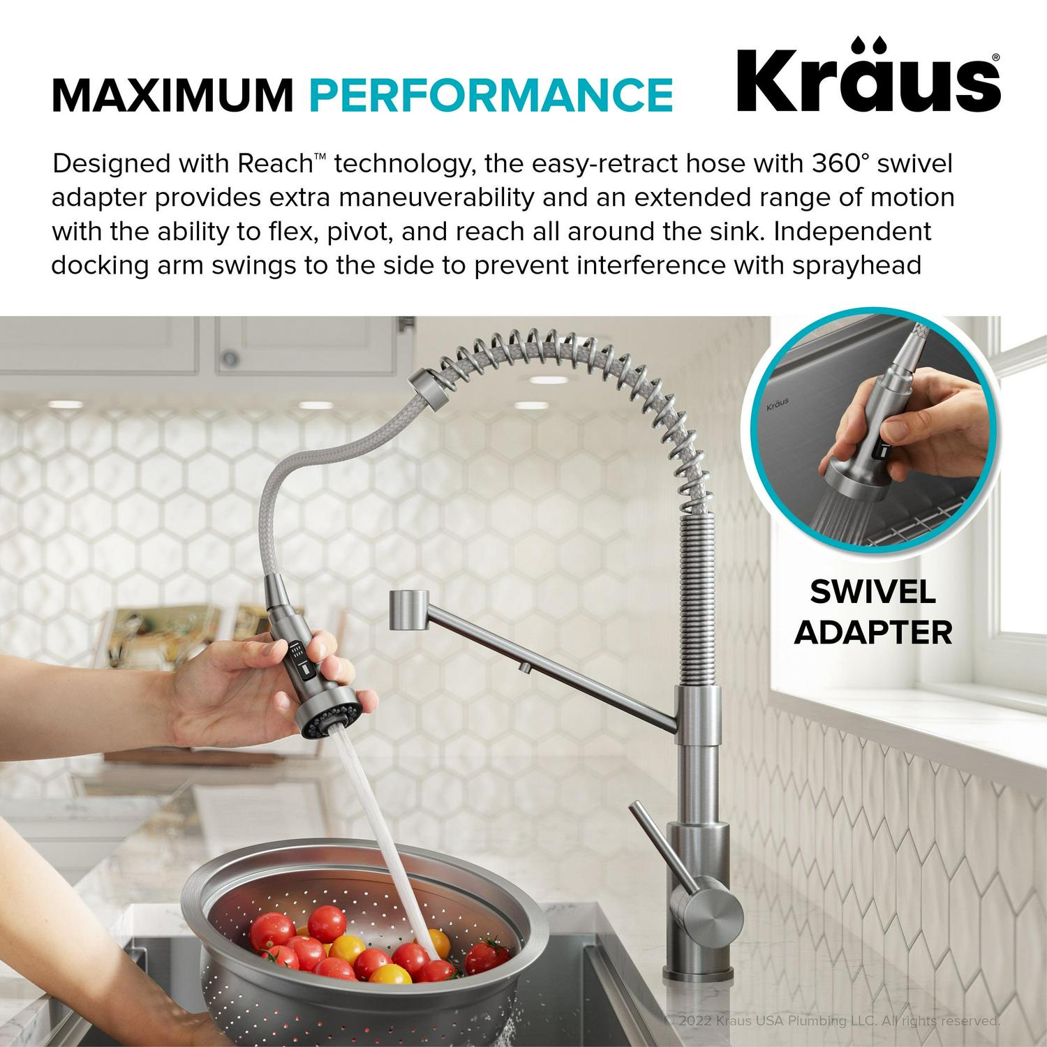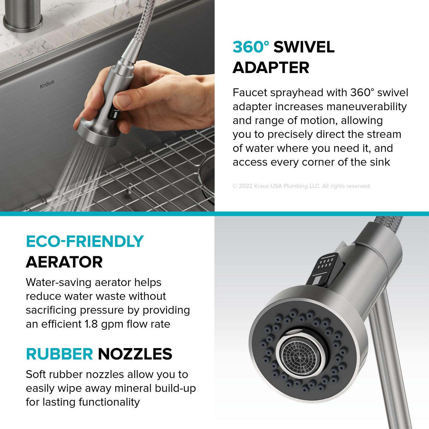 – PULL-DOWN SPRAYHEAD with Reach Technology offers maximum maneuverability, with an easy-retract hose and swivel adapter that enables a full range of motion so you can flex, pivot, and reach all around the sink