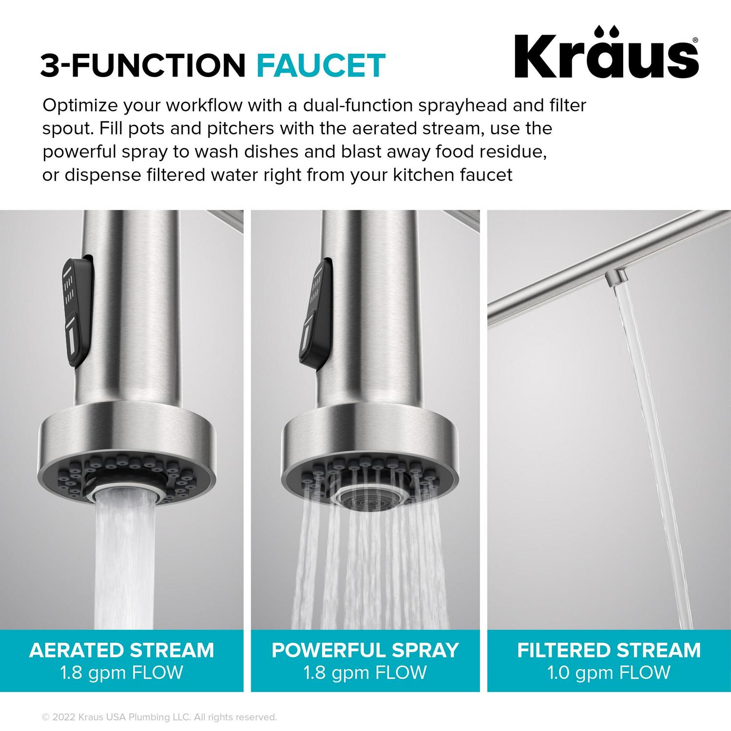 – 3-FUNCTION FAUCET: Switch between aerated stream for everyday cleaning, powerful spray for heavy-duty rinsing, or dispense filtered water right from your kitchen faucet