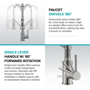 – High-arc spout offers ample room underneath the faucet for oversized items like tall pitchers, swivels 180° for a broad range of motion