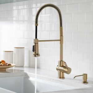 Kraus Britt Single Handle Commercial Kitchen Faucet with Deck Plate and Soap Dispenser in Spot Free Antique Champagne Bronze Finish