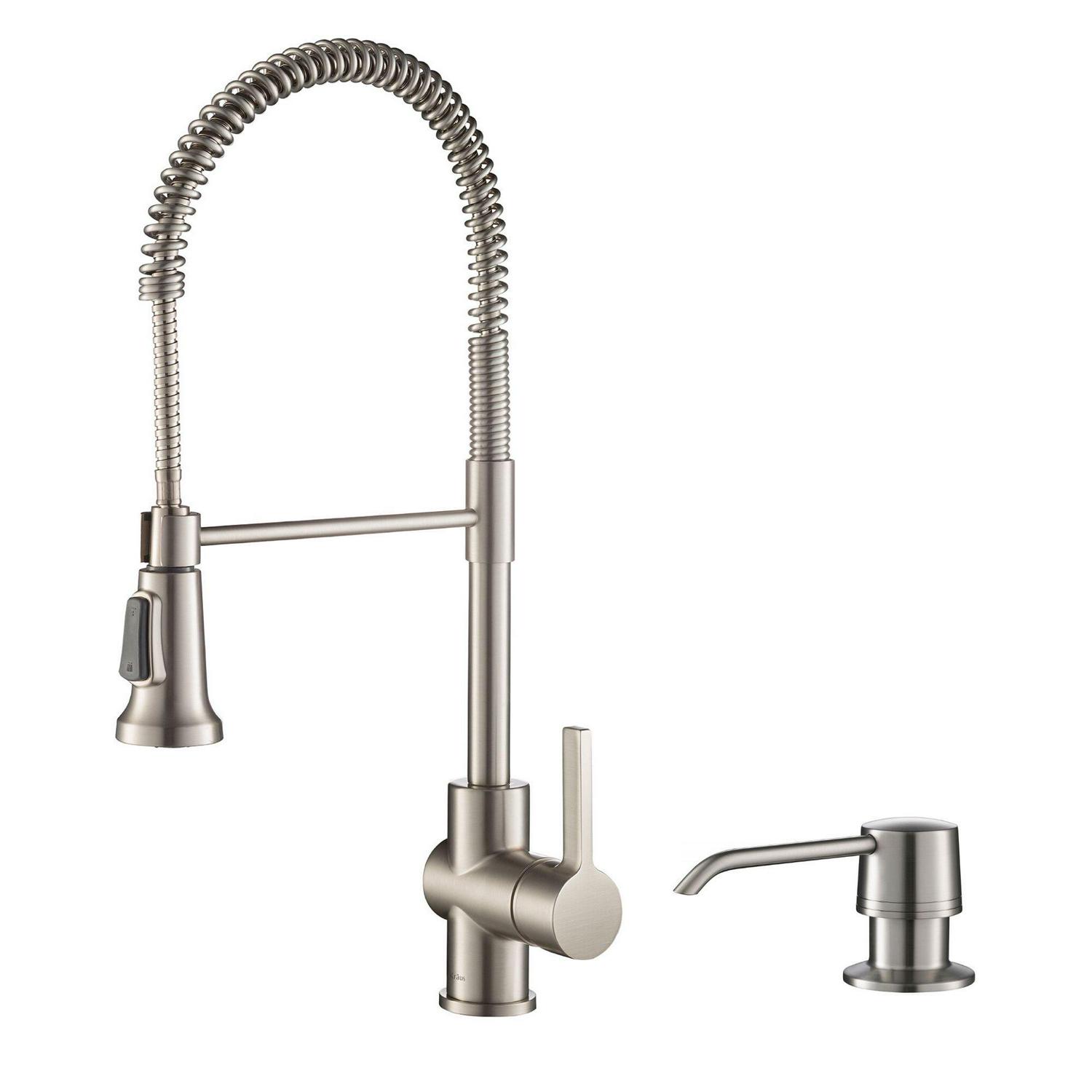 KRAUS Britta c Single Handle Commercial Kitchen Faucet with Deck Plate and Soap Dispenser in all-Britea c Spot Free Stainless Steel Finish