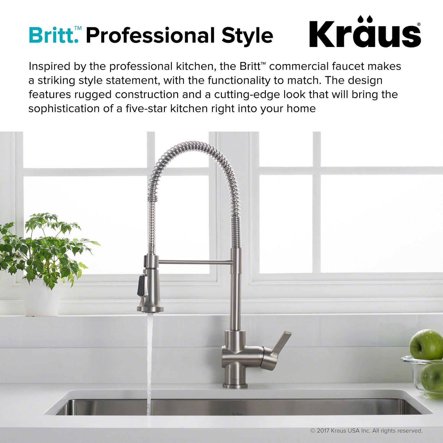 Inspired by professional kitchen design, the Britt commercial faucet blends performance and style to help you build the kitchen of your dreams. Features a flexible, commercial-style open coil spout with stainless steel hose and secure docking arm. Comes with a soap dispenser and optional deck plate which allows you to install this single handle faucet with a 1, 2, or 3-hole sink. Available in spot free finish.