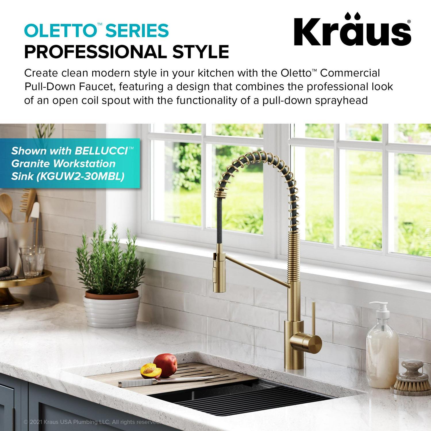 Create clean modern style in your kitchen with the Oletto Commercial Pull-Down Faucet, featuring a design that combines the professional look of an industrial-style open coil spout with the flexible functionality of a pull-down sprayhead. Perfect for an easy DIY kitchen renovation, the Oletto faucet is designed with QuickDock mounting technology that allows you to install the faucet from above the countertop within minutes, with no need to secure it underneath the sink. Pre-attached water lines allow you to easily complete your home improvement project with no need to call in a professional plumber. The high-arc spout offers ample space for oversized items like tall pitchers, with an independent docking arm that rotates to prevent interference with the sprayhead. The ergonomic single lever handle is designed with 90 degree forward rotation, allowing for installation flexibility in spaces with limited backsplash clearance. A dual function pull-down sprayer with swivel adapter provides superior maneuverability and an extended range of motion, allowing you to reach all around the kitchen sink. The robust design features lead-free solid brass construction and premium components, including a long-lasting leak-free ceramic cartridge. Available in a variety of durable corrosion-resistant finishes designed to protect your faucet for a lifetime – including proprietary all-Brite Spot-Free Finishes that make an ideal choice for busy kitchens.