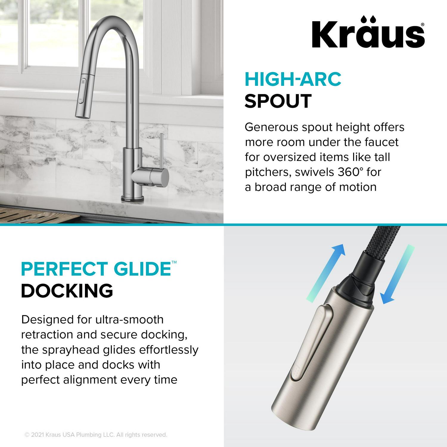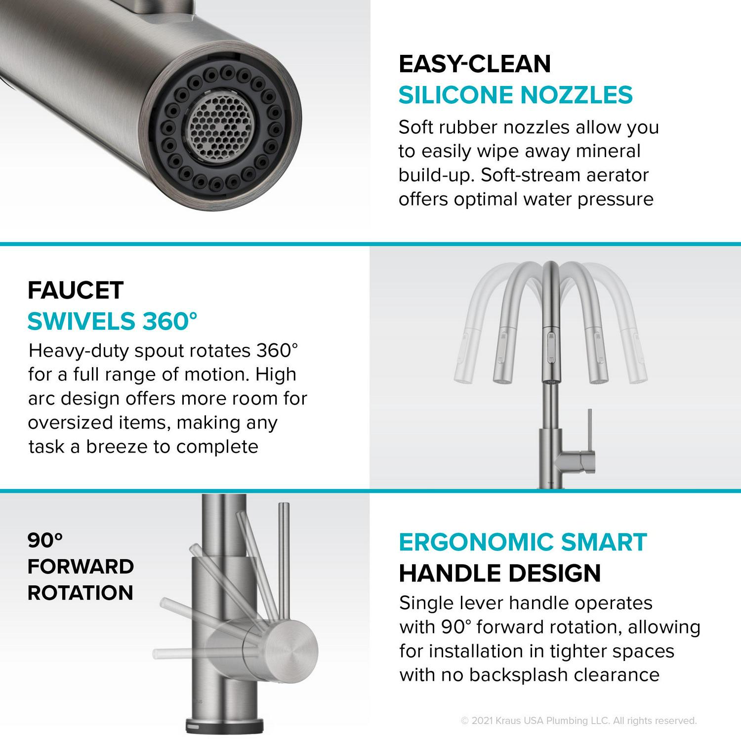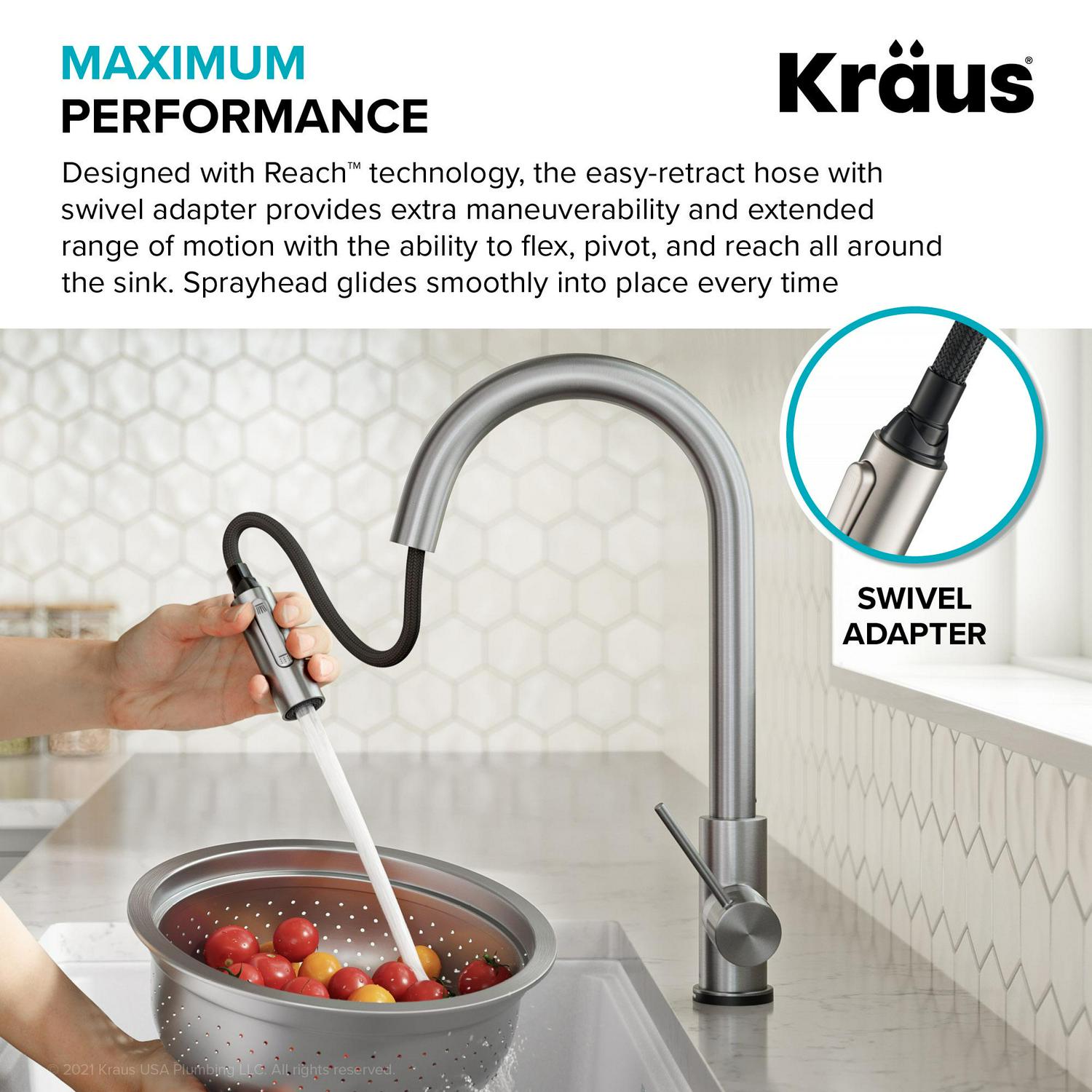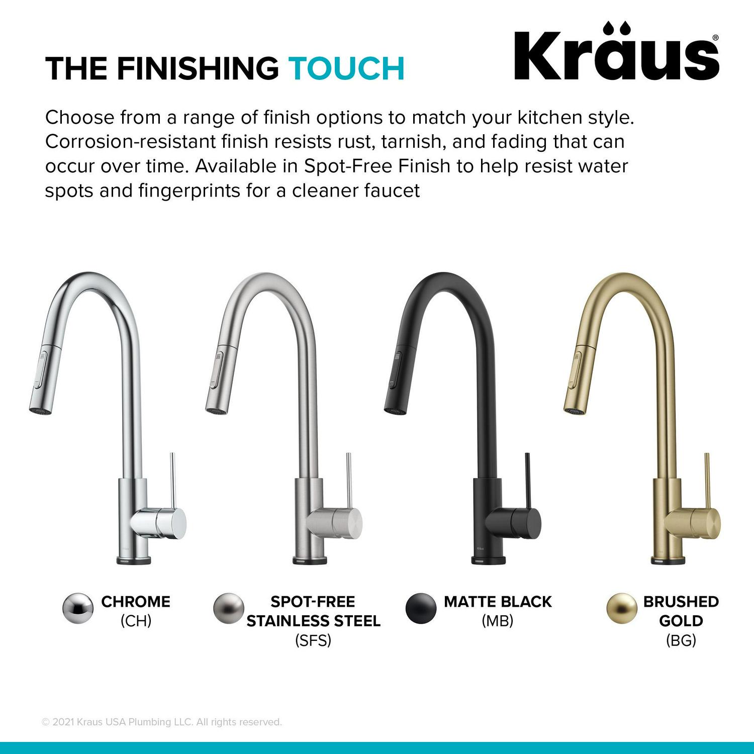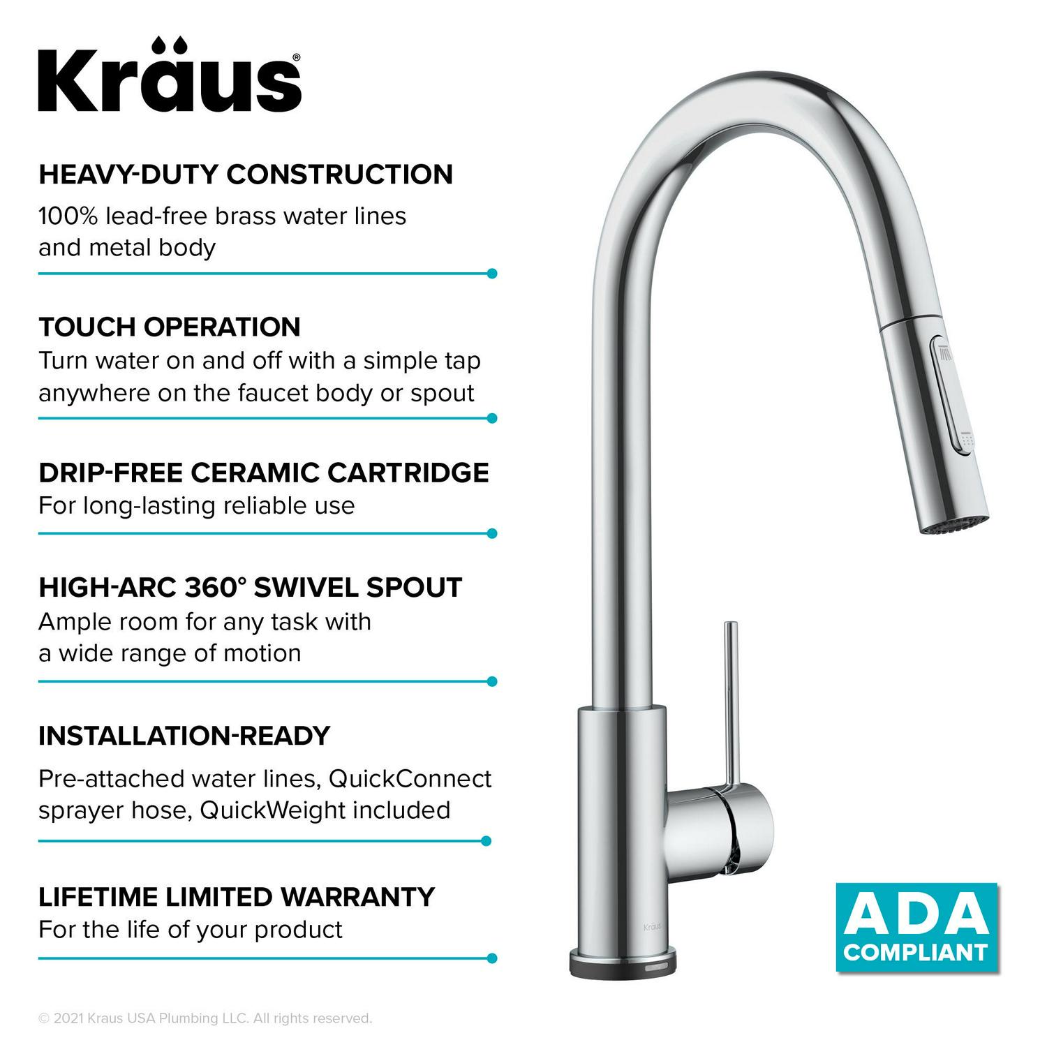 With bold cylindrical geometry, the Touch-Control Oletto Pull-Down Faucet offers a fresh take on contemporary design. Have your hands full in the kitchen, No problem Touch-activated Tap Flow technology allows you to turn the flow of water on and off with a gentle touch anywhere on the faucet body or spout. Perfect for busy kitchens, this KRAUS Clean Home Product helps reduce germ transfer by eliminating the need to grab the faucet handle after messy tasks like handling raw ingredients. The optimized 16-inch height fits under standard cabinets for installation flexibility in any kitchen. The high-arc spout offers maximum clearance for oversized items, and swivels 360 degrees for full sink access. Designed for ease of use, the ergonomic handle works with 90 degrees forward rotation for smooth operation and installation flexibility in spaces with limited backsplash clearance. A dual function pull-down sprayer with swivel adapter provides an extended range of motion all around the kitchen sink. The design features lead-free brass waterlines, all-metal body, and a leak-free ceramic cartridge for worry-free use. Installation is easy with pre-attached water lines and snap-On counterweight. Choose from a range of durable corrosion-resistant finishes, including easy-to-clean Spot Free Finish that prevents water spots and fingerprints for a cleaner faucet. Engineered for greater comfort and convenience, Oletto Faucets with Tap Flow Technology solve everyday problems with a simple touch