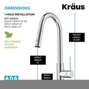 – DIMENSIONS: Faucet Height: 16 3/8 in. Spout Height: 8 in. Spout Reach 9 in. Swivels 360 degrees for a full range of motion Eco-Friendly Flow Rate 1.8 gpm FITS under most kitchen cabinets for installation flexibility