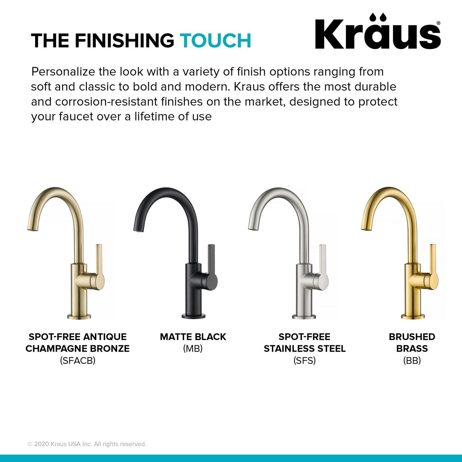 The elegant Oletto bar faucet features a clean silhouette with gooseneck spout that creates a stylish focal point for any bar, prep, or entertainment area. The compact modern design is perfect for smaller kitchens where space is at a premium, and pairs perfectly with the Oletto Series kitchen faucets KPF-2820 and KPF-2821 for a cohesive look in larger kitchens. Designed for ease of use, the ergonomic comfort-grip handle operates with 90-degree forward rotation, allowing for smooth operation as well as installation flexibility in spaces with limited backsplash clearance. The spout swivels 360 degrees for total access to every part of the sink, allowing you to redirect the flow of water as needed. The robust design features lead-free solid brass construction and state-of-the-art components, including a ceramic cartridge engineered to last twice as long as the industry standard, to ensure a lifetime of worry-free use. Installation is simple and convenient with flexible pre-attached water lines and all required mounting hardware included. To personalize the look, choose from a variety of durable and corrosion-resistant finishes that are designed to protect your faucet over a lifetime of use including proprietary Spot Free Finishes that make an ideal choice for busy kitchens.
