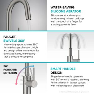 – GOOSENECK SPOUT: Generous spout height offers more room underneath the faucet for pitchers and glassware, swivels 360° for access to every part of the sink