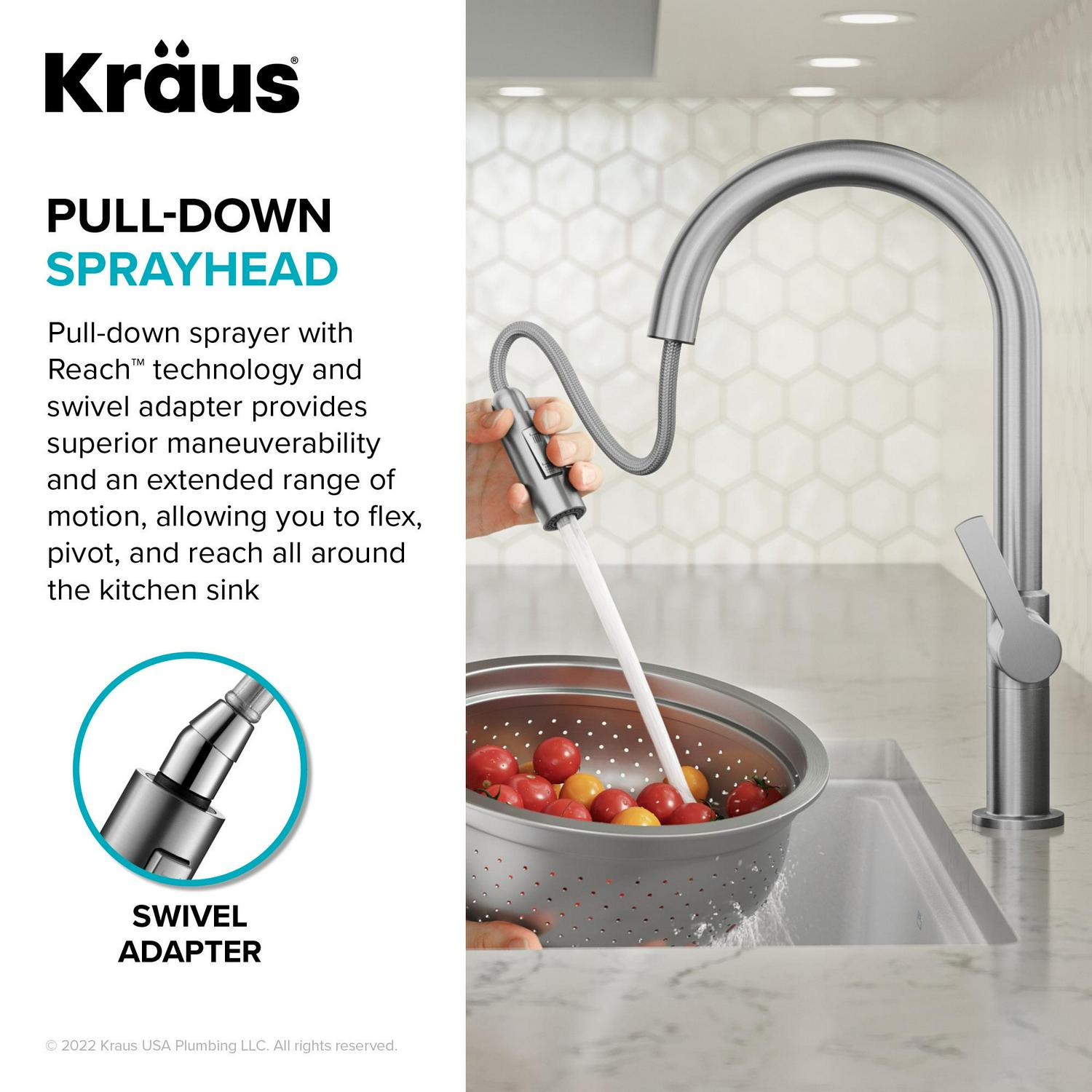 Pull-down spray head with Reach Technology offers maximum maneuverability, with an easy-retract hose and swivel adapter that enables a full range of motion so you can flex, pivot, and reach all around the sink.