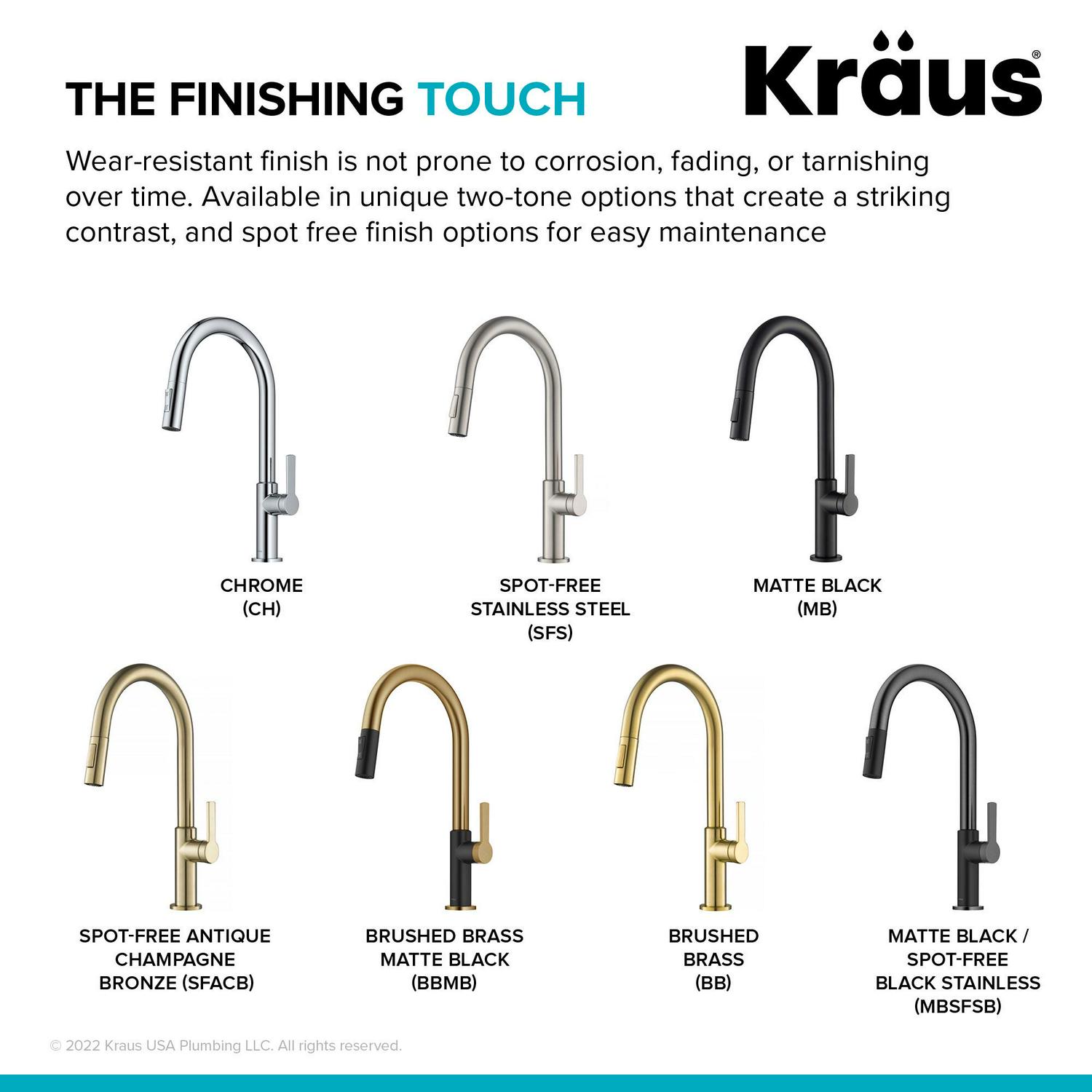 The wear-resistant finish is not prone to corrosion, fading, or tarnishing over time. Also available in unique two-tone options that create a striking contrast, and Spot Free Finish options for easy maintenance.