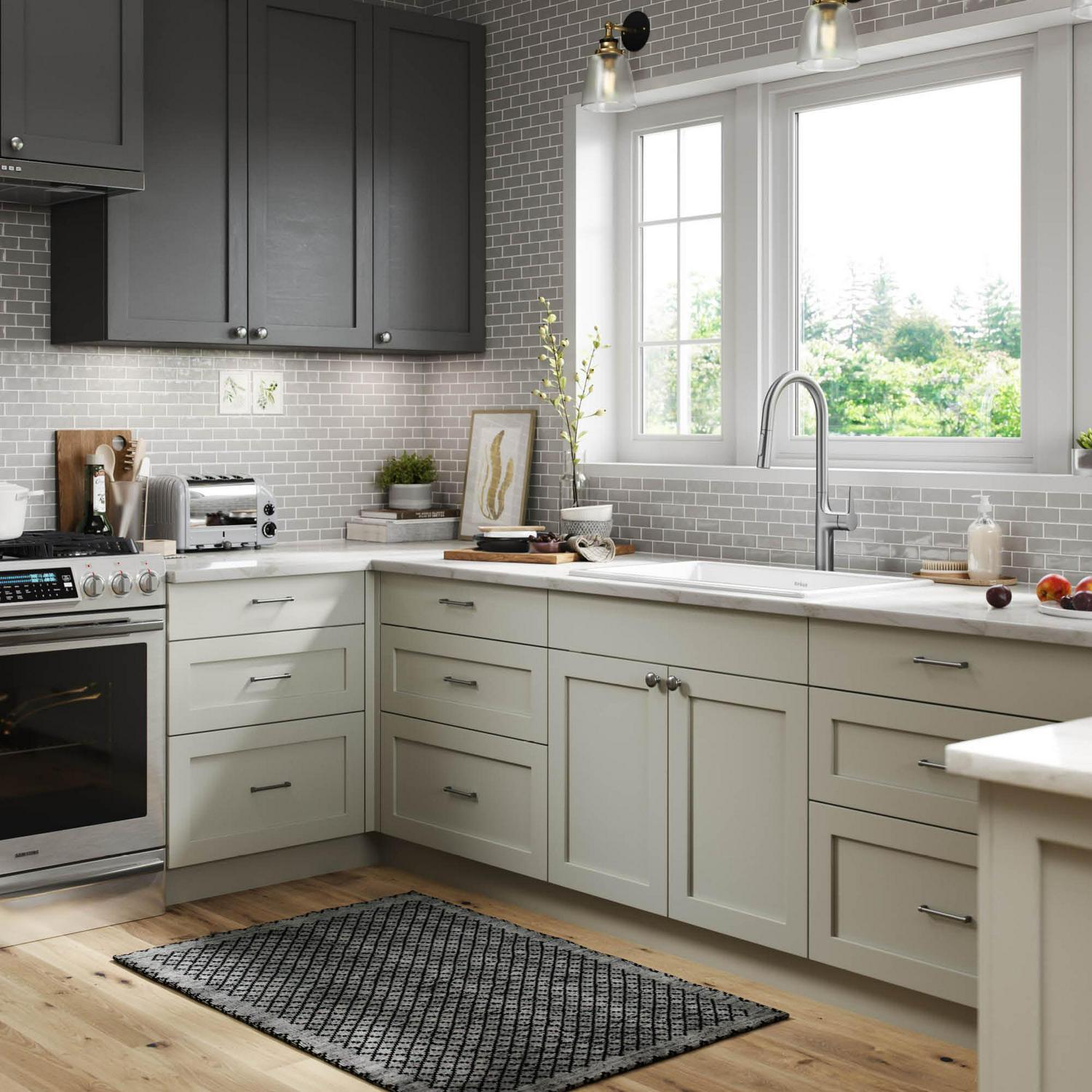 Sleek and elegant, the Oletto Contemporary Pull-Down Faucet features a clean minimalist design and universal appeal. With fluid lines and a streamlined silhouette, the ultra-versatile design creates an uncluttered look in any kitchen. The high-arc spout offers maximum space for oversized items like large cookware and tall pitchers, making an ideal complement for large kitchen sinks as well as smaller sinks on a kitchen island or in compact kitchens. Designed for ease of use, the ergonomic handle operates with 90 degree forward rotation, allowing for smooth operation as well as installation flexibility in spaces with limited backsplash clearance. A dual function pull-down sprayer with swivel adapter provides superior maneuverability and an extended range of motion, allowing you to flex, pivot, and reach all around the kitchen sink. The robust design features lead-free solid brass construction and state-of-the-art components, including a ceramic cartridge engineered to last twice as long as the industry standard, to ensure a lifetime of worry-free use. Installation is simple and convenient with flexible pre-attached water lines and QuickWeight snap-on counterweight that will simplify your next renovation project. To personalize the look, choose from a variety of durable and corrosion-resistant finishes that are designed to protect your faucet over a lifetime of use – including proprietary Spot Free Finishes that make an ideal choice for busy kitchens.