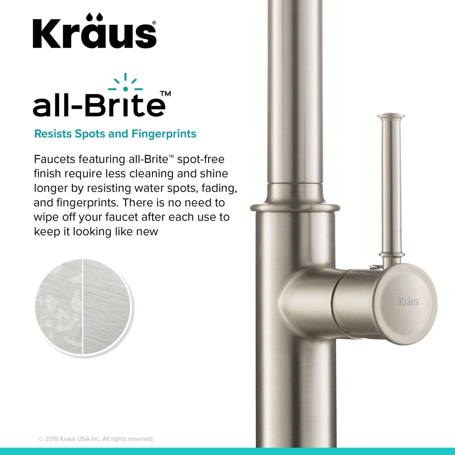 – Kraus Finishes resist corrosion and rust, surpass industry durability standards, and will not fade over time. A range of choices is available: Chrome, Oil-Rubbed Bronze, and all-Brite Spot Free Stainless Steel Finish