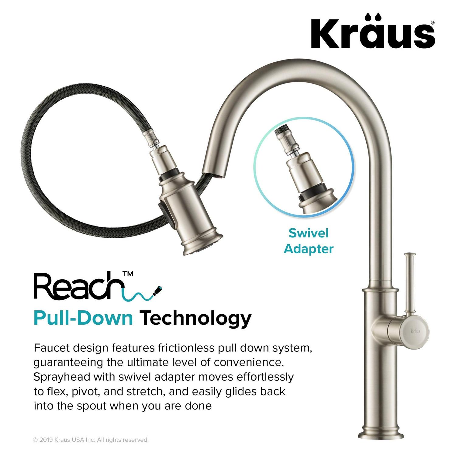 – Pull-Down System with Reach Technology: State-of-the-art spout, swivel sprayhead connector, and counterweight offer frictionless performance. Sprayhead moves effortlessly to flex, pivot, stretch, and easily glide back into the spout