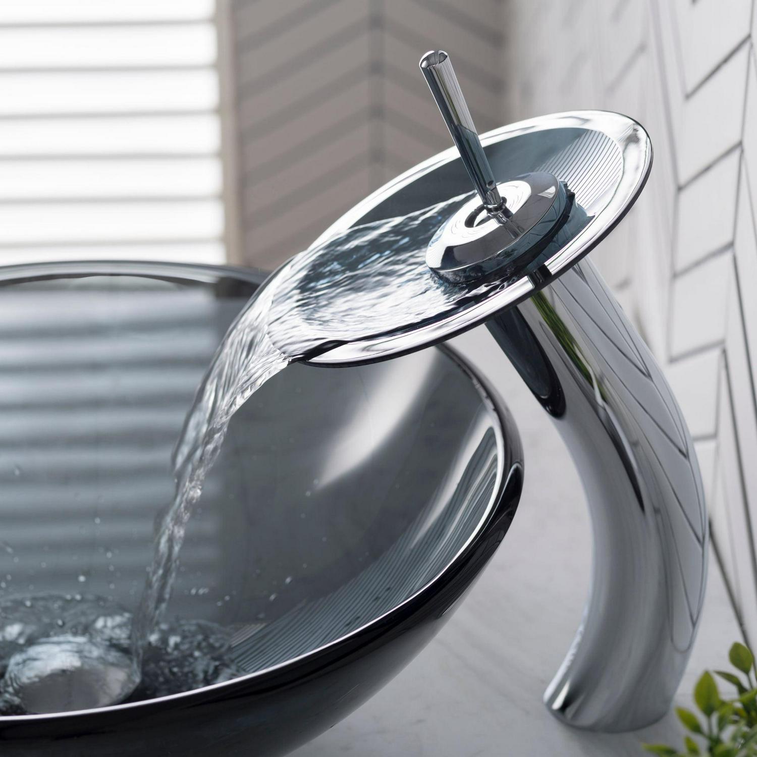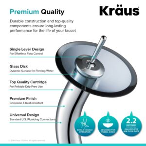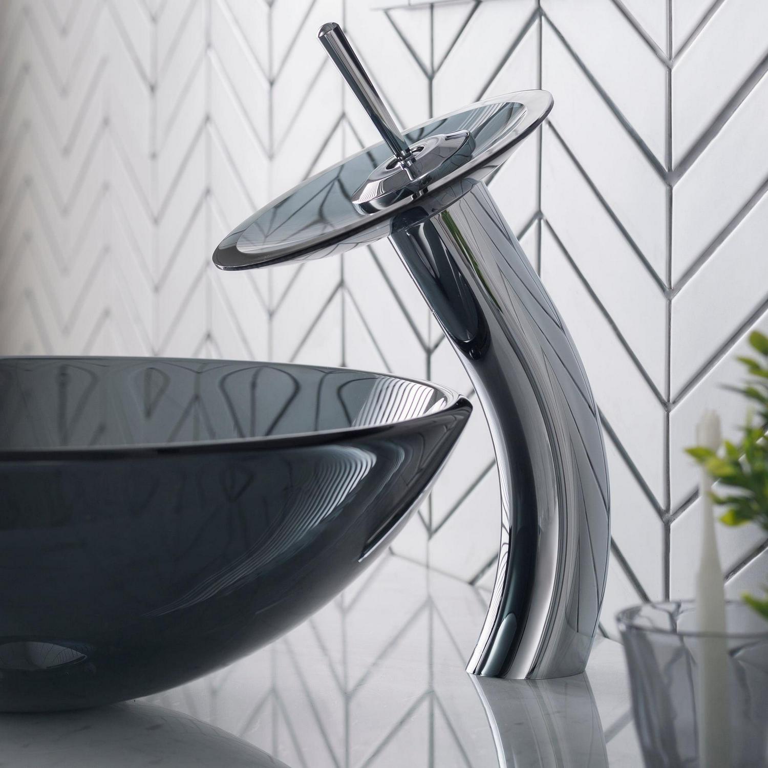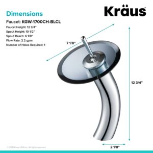 KRAUS Tall Waterfall Bathroom Faucet for Vessel Sink with Clear Black Glass Disk, Chrome Finish