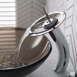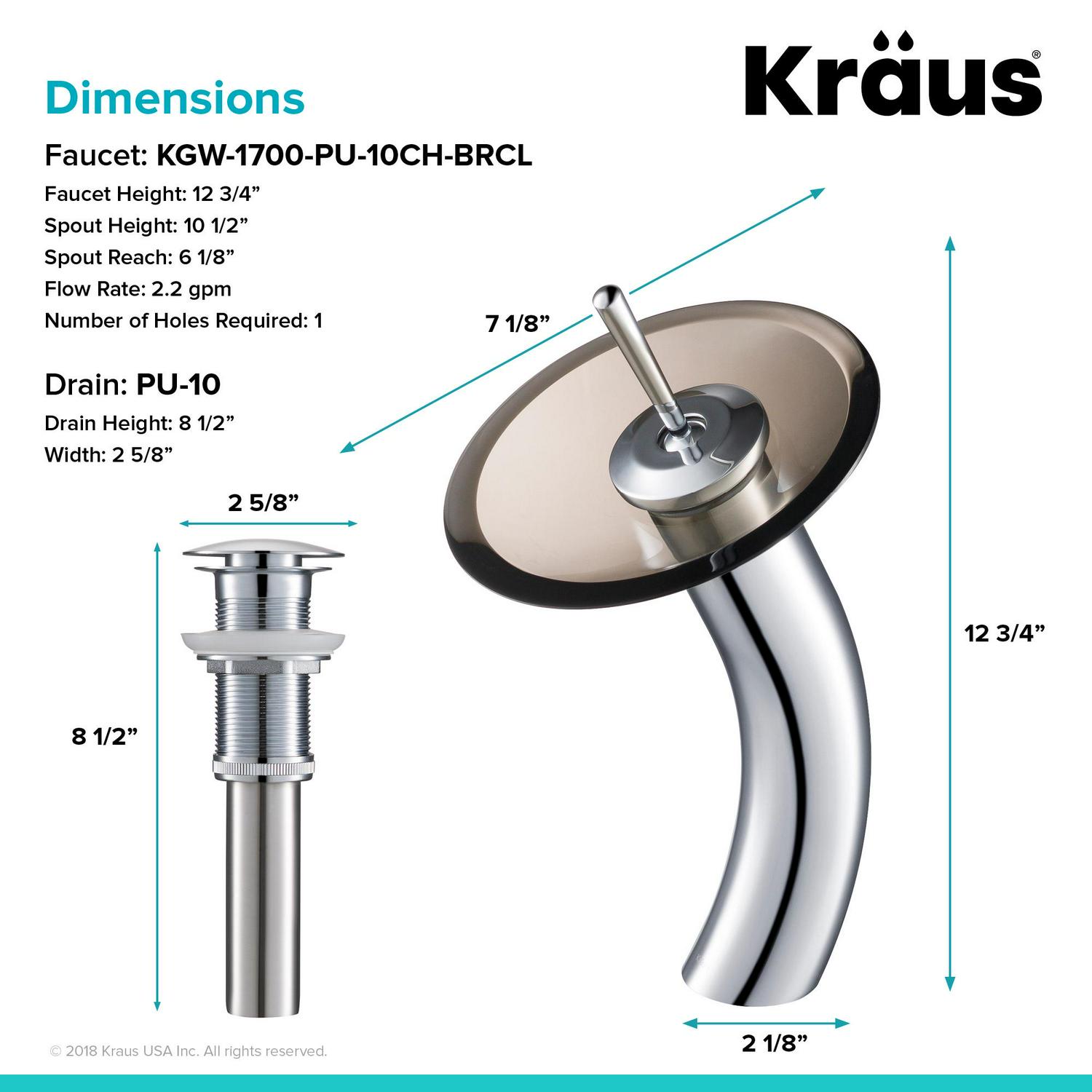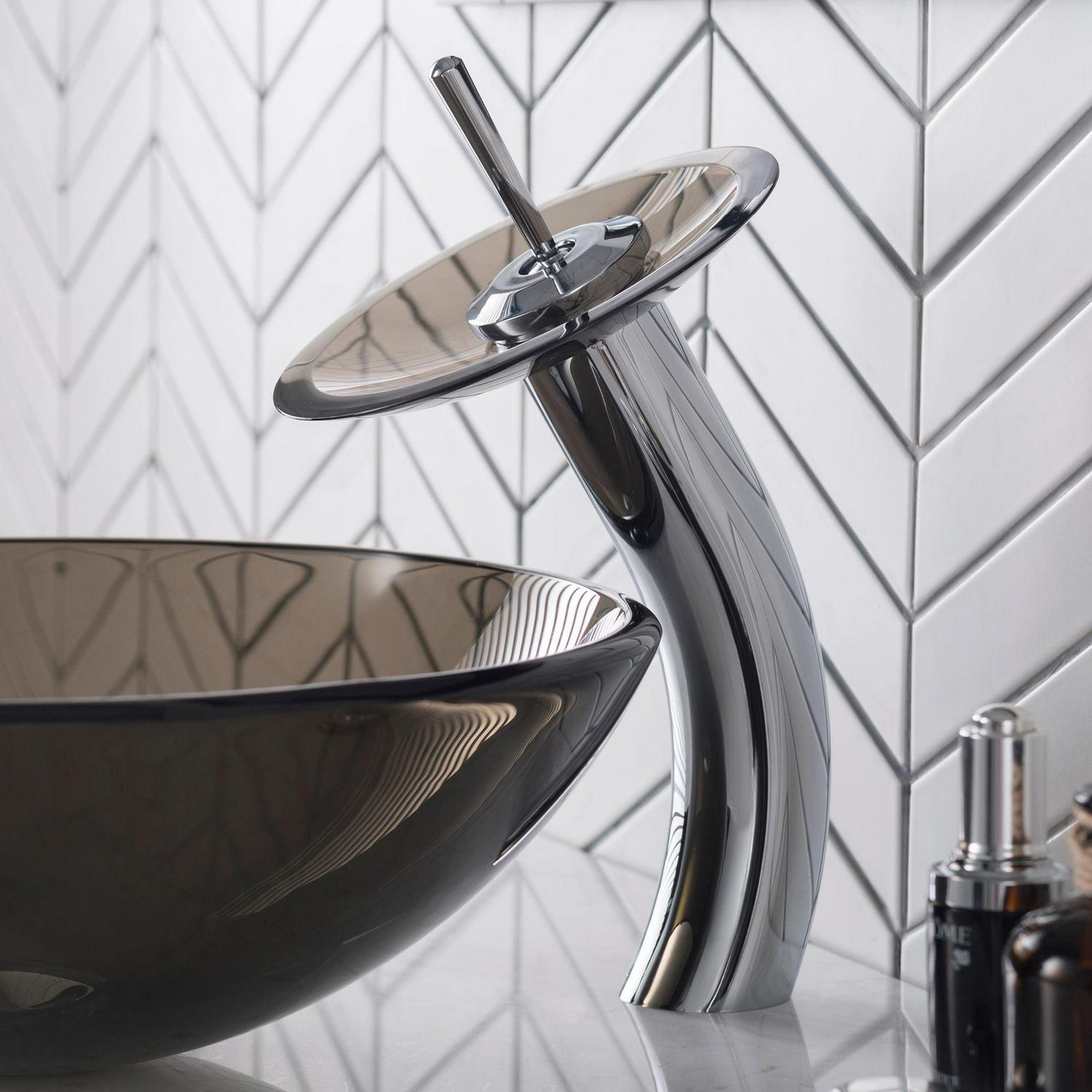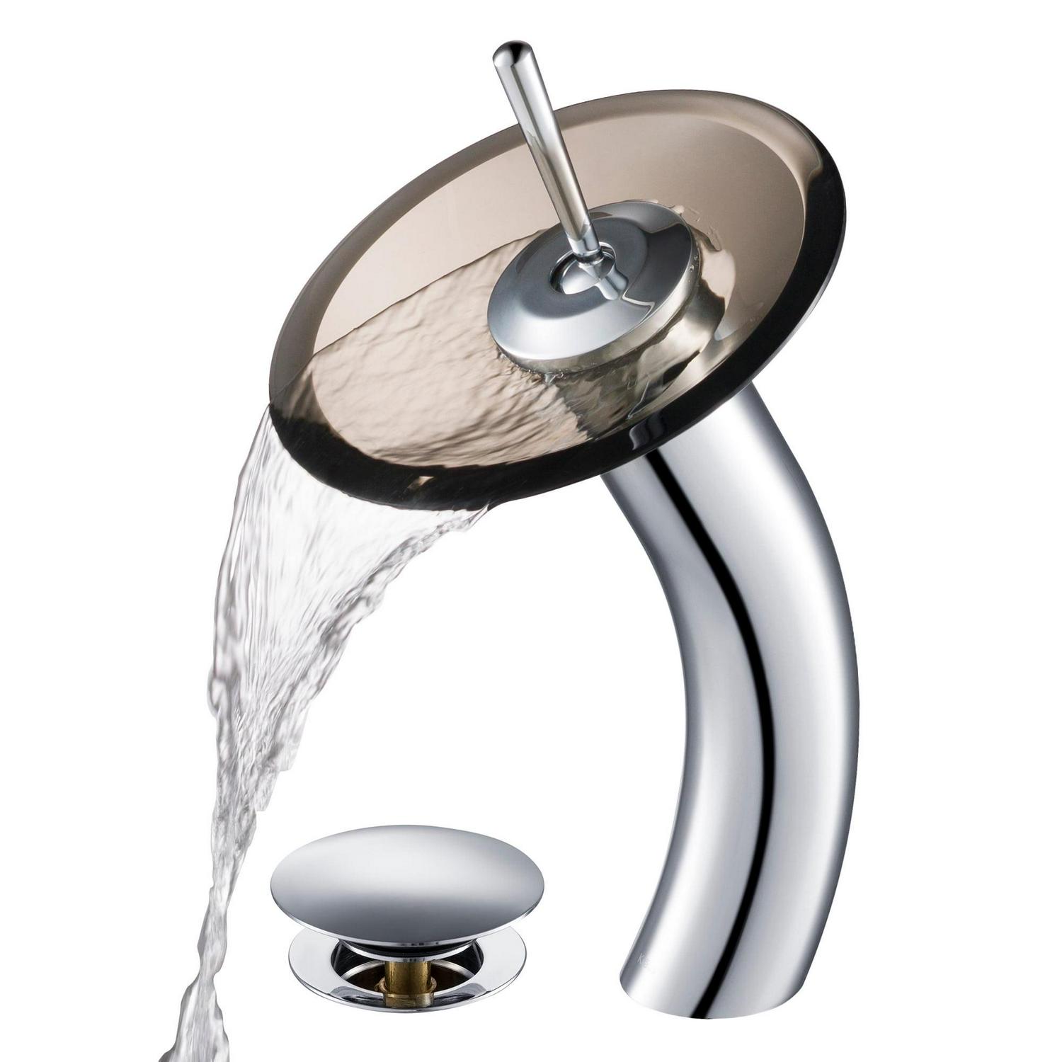 Kraus Tall Waterfall Bathroom Faucet for Vessel Sink with Clear Brown Glass Disk and Pop-Up Drain, Chrome Finish