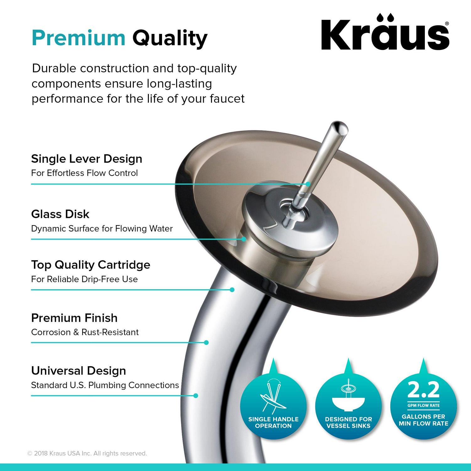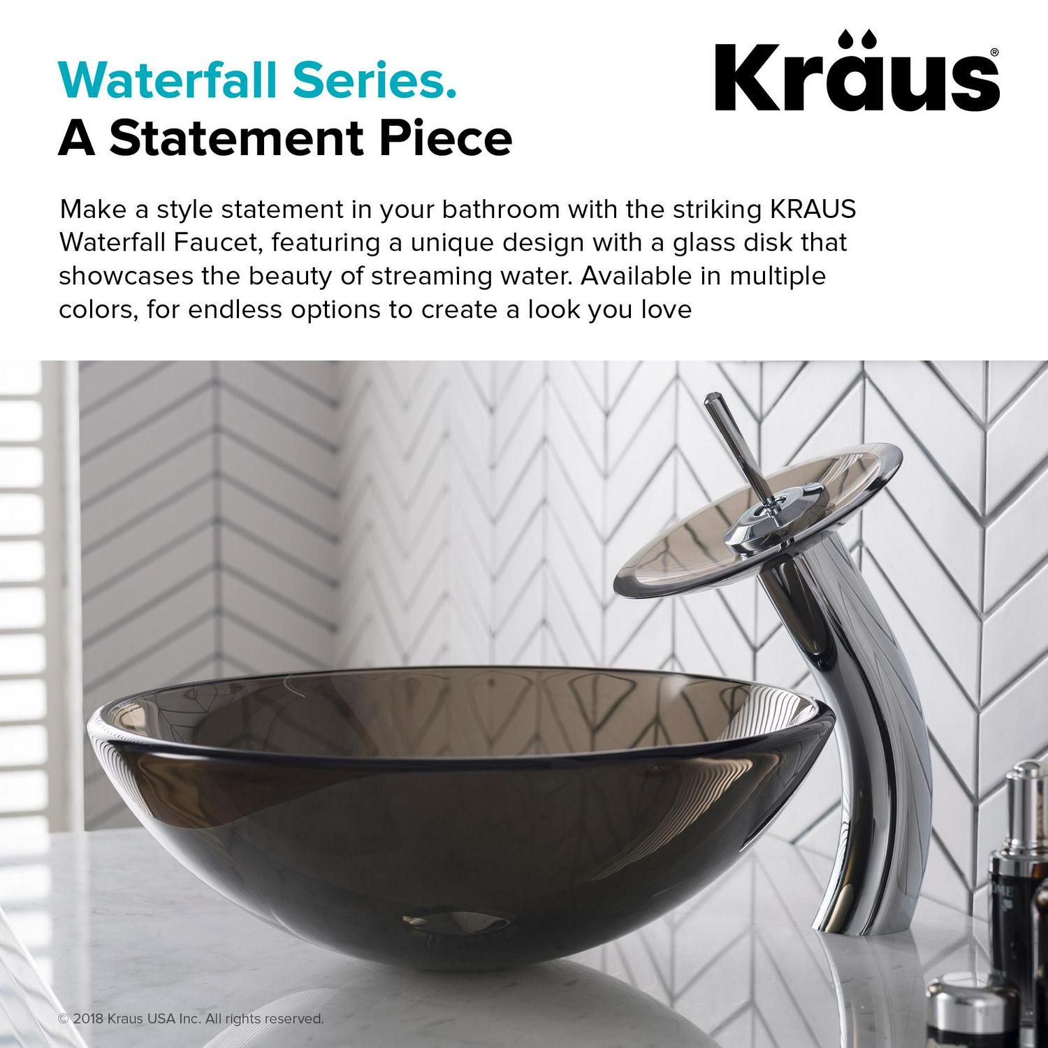 Make a style statement in your bathroom with the stunning KRAUS waterfall faucet, featuring a distinctive glass disk that showcases the beauty of streaming water. Available in multiple colors for endless options to create a look you love. A Stylish Centrepiece: Vessel faucet with tempered glass disk makes an eye-catching design element for any bathroom décor.