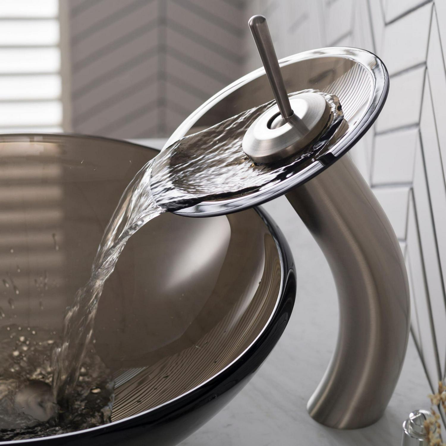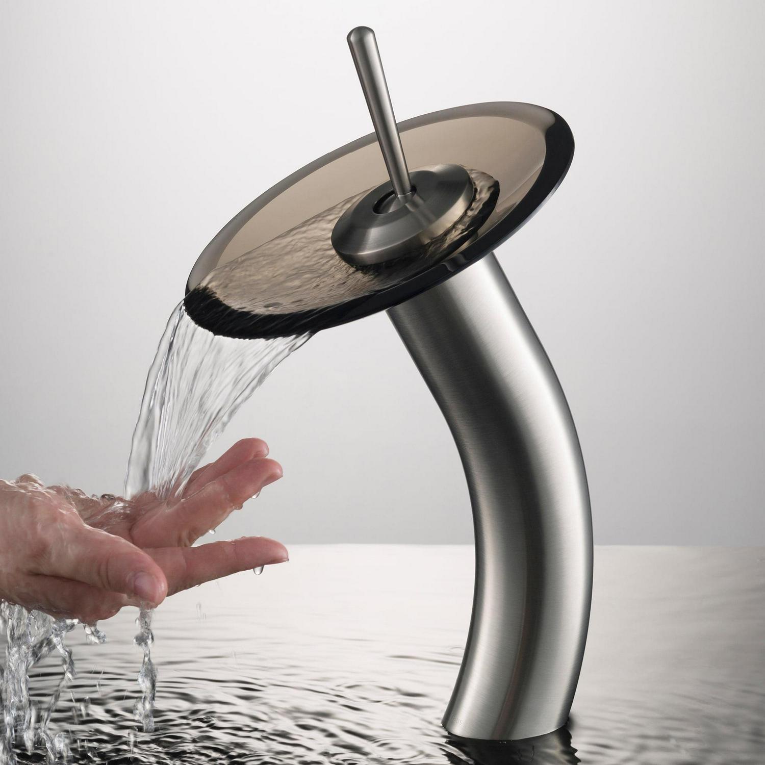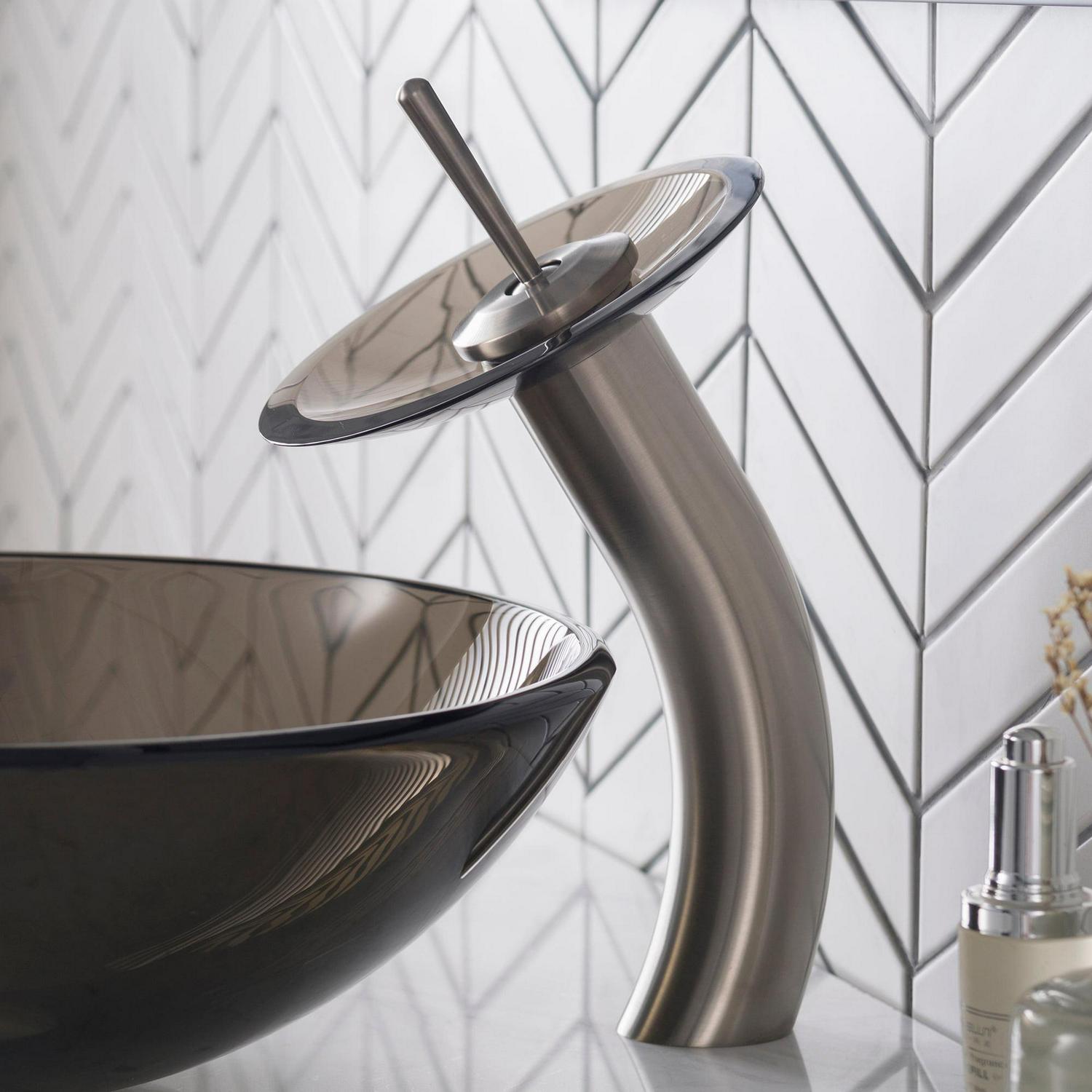Kraus Tall Waterfall Bathroom Faucet for Vessel Sink with Clear Brown Glass Disk, Satin Nickel Finish