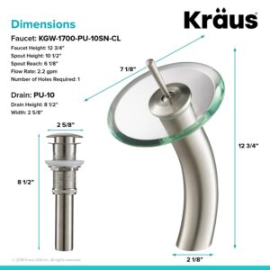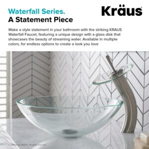 KRAUS Tall Waterfall Bathroom Faucet for Vessel Sink with Clear Glass Disk and Pop-Up Drain, Satin Nickel Finish
