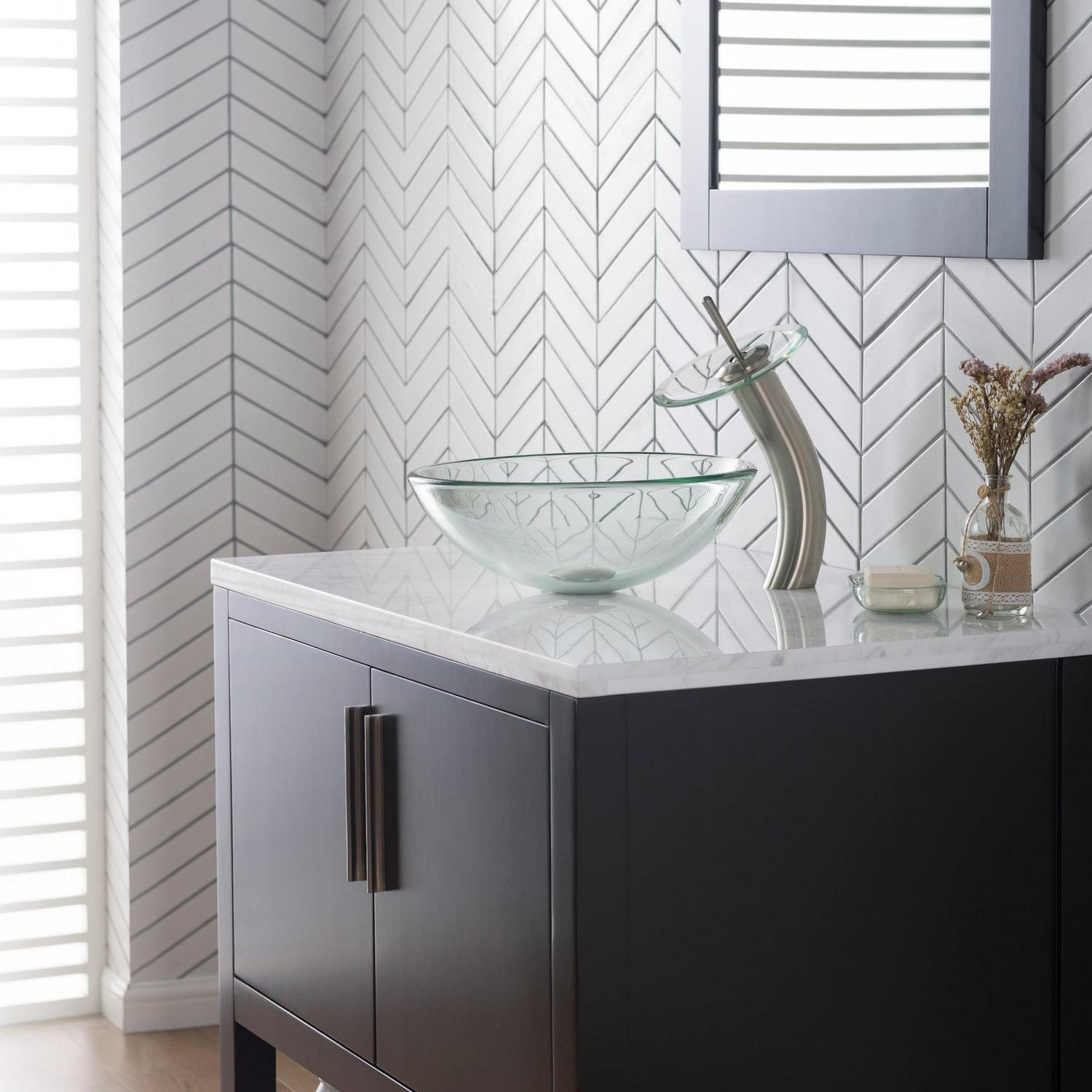– A Stylish Centerpiece: Vessel faucet with tempered glass disk makes an eye-catching design element for any bathroom décor