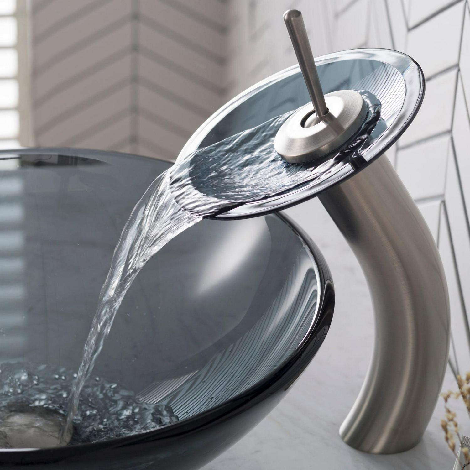 Make a style statement in your bathroom with the stunning KRAUS waterfall faucet, featuring a distinctive glass disk that showcases the beauty of streaming water. Available in multiple colors for endless options to create a look you love