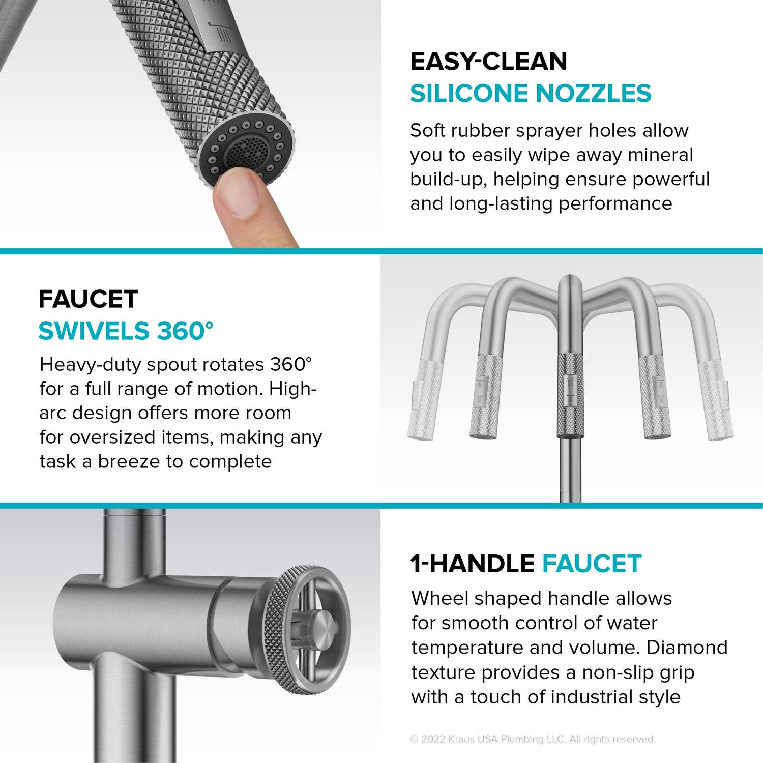 – KNURLED HANDLE GRIP: Diamond texture on faucet sprayer and handle provides a non-slip grip while adding a touch of industrial style