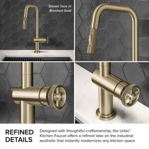 The Urbix Pull-Down Kitchen Faucet brings rugged sophistication to any kitchen, with an angular silhouette that is enhanced by diamond-textured accents for a bold industrial look. The wheel-shaped handle allows for smooth control of water temperature, and diamond knurling creates a non-slip grip. A pull-down spray head with swivel adapter provides easy manoeuvrability so you can flex and reach all around the sink. Robust design features solid brass construction and premium components including ceramic cartridge, Snap-on counterweight, and quick connect sprayer hose for lasting leak-free use. Available in a variety of corrosion-resistant finishes, including easy-to-clean Spot-Free Stainless-Steel Finish. Pre-attached water lines and mounting hardware included for easy DIY installation.